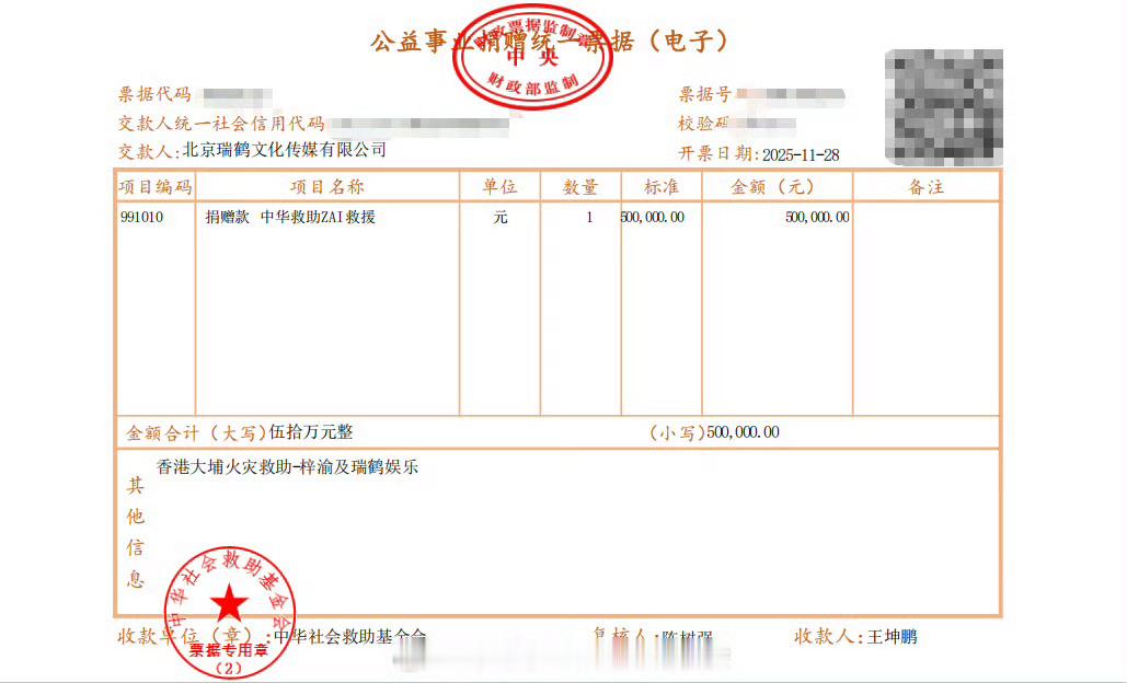 其实梓渝捐赠了100万,与公司瑞鹤娱乐一同捐赠50万,携手范趣町捐赠50万,一共