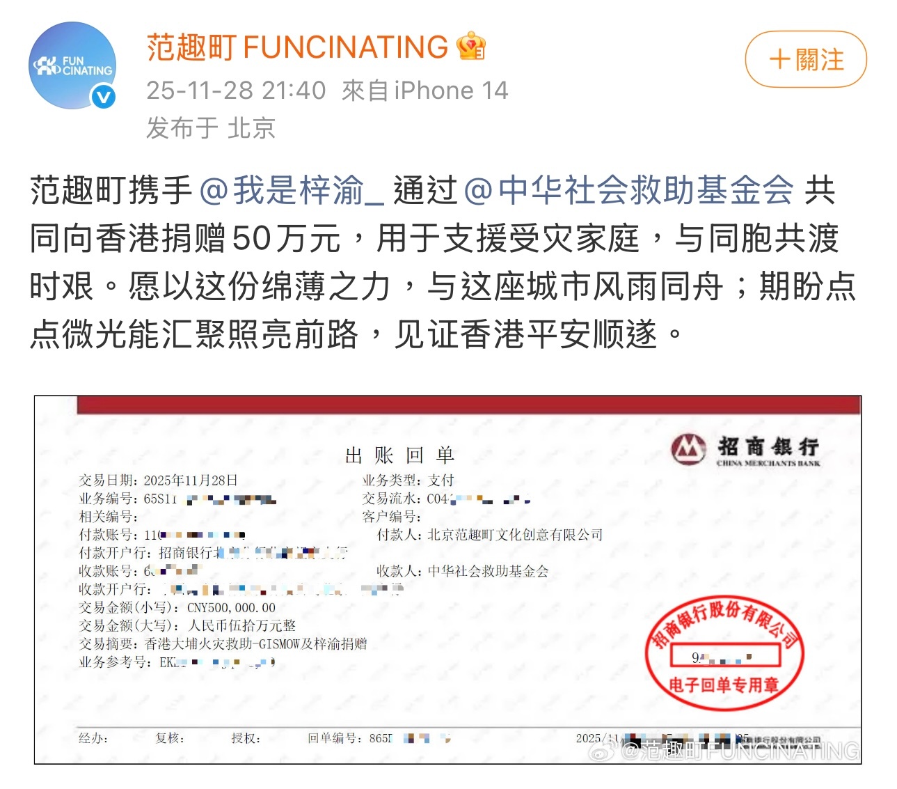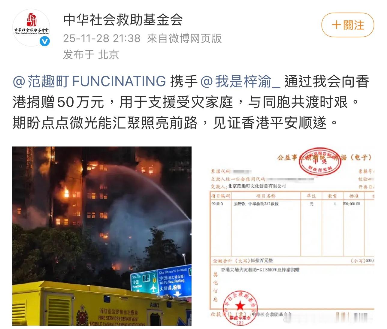 范趣町携手梓渝向香港捐赠50万元,用于支援受灾家庭,与同胞共渡时艰,一起传递爱心,愿家园尽快恢复安宁。