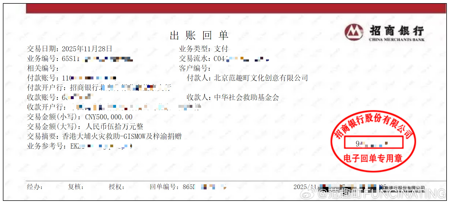 其实梓渝捐赠了100万,与公司瑞鹤娱乐一同捐赠50万,携手范趣町捐赠50万,一共