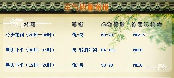 【苏州每日空气质量实况和预报】今日(截至15时)空气质量实况:良,AQI指数:99,首要污染物:PM2.5,昨日PM2.5日均浓度:0.107毫克/立方米。空气质量预报详见图片。