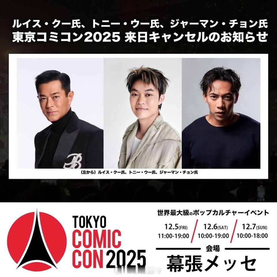 宏福苑五級火︱古天樂取消出席東京動漫節:冇辦法抱正常心態出席東京動漫節(Tokyo Comic Con 2025)即將於12月5日至7日於東京幕張舉行,原定代表《九龍城寨之圍城》出席的古天樂、胡子彤及張文傑,三人於今日(28日)晚間親自拍片確認,因應「大埔宏福苑五級火」嚴重事件,將會取消行程缺席動漫節。古天樂原定代表《九龍城寨之圍城》出席東京動漫節。(《九龍城寨之圍城》電影劇照)胡子彤原定代表《九龍城寨之圍城》出席東京動漫節。(《九龍城寨之圍城》電影劇照)張文傑原定代表《九龍城寨之圍城》出席東京動漫節。(《九龍城寨之圍城》電影劇照)古天樂攜同胡子彤、張文傑身穿黑衣,神情凝重面對鏡頭,由古天樂作代表宣布:「由於香港大埔發生嚴重火災,造成重大傷亡,全香港市民包括我哋都深感悲痛。喺呢個沉重嘅時刻,我哋實在冇辦法抱正常嘅心態出席今次嘅活動,所以我哋將不會參與12月5號及6號東京Comic Con活動。希望原本計劃出席活動嘅朋友及受影響嘅相關單位能夠體諒,我哋深感歉意。最後,希望逝者安息,傷者早日康復。」古天樂攜同胡子彤、張文傑身穿黑衣,神情凝重面對鏡頭,由古天樂作代表宣布取消出席東京動漫節。(影片截圖)東京動漫節下午亦於社交媒體發聲明,宣布古天樂、胡子彤及張文傑在緊急通知下取消行程:「因應香港於11月26日星期三發生的大規模火災,由於災情需要被高度重視及關注支持,因此需要修改原定日本之行。」主辦單位亦代表向已購票的活動出席者致歉:「抱歉讓大家期待三位光臨,但希望大家能夠體諒香港目前的狀況。我們會禱告紀念每一位受災情影響的人。」張文傑較早前亦於限時動態中公布個人生日粉絲見面活動將會延期舉行。東京動漫節透過官方社交媒體宣布,因應「宏福苑五級火」災情,古天樂、胡子彤及張文傑將會缺席活動。(東京動漫節IG圖片)張文傑亦於社交媒體發布生日粉絲見面會亦會延期。(張文傑IG截圖)