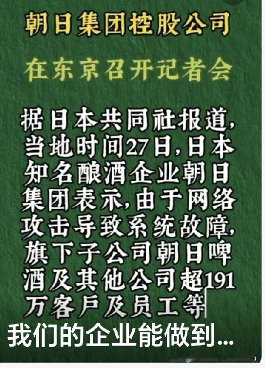 日本朝日集团遭黑客攻击!191万条核心信息险泄露,损失惨重 突发消息!日本那边又出大事,让人看着都揪心! 就在11月27日,日本知名企业朝日集团突然发公告,承认自己遭了网络攻击,超过191万条核心信息都面临着泄露的风险。 这攻击其实9月份就发生了,动手的是“Qilin”黑客组织,偷走的信息里,有152.5万条是客户的,还有38.9万条和员工相关,像姓名、住址这些隐私信息都可能保不住。 受攻击影响,集团30家工厂曾一度停摆,啤酒、饮料的出货跟着大受影响,10月份饮料销量只到去年同期的六成,每天的损失差不多得7500万人民币。 CEO虽然出面鞠躬道歉了,但压根没提赔偿的事,受损的系统要到明年2月才有望全面恢复。 看法:不管多大的企业,网络安全都不能掉以轻心,信息泄露不仅坑用户,自己也得付出惨痛代价,出了事别藏着,早点公开、拿出实在的解决办法才是正经事。