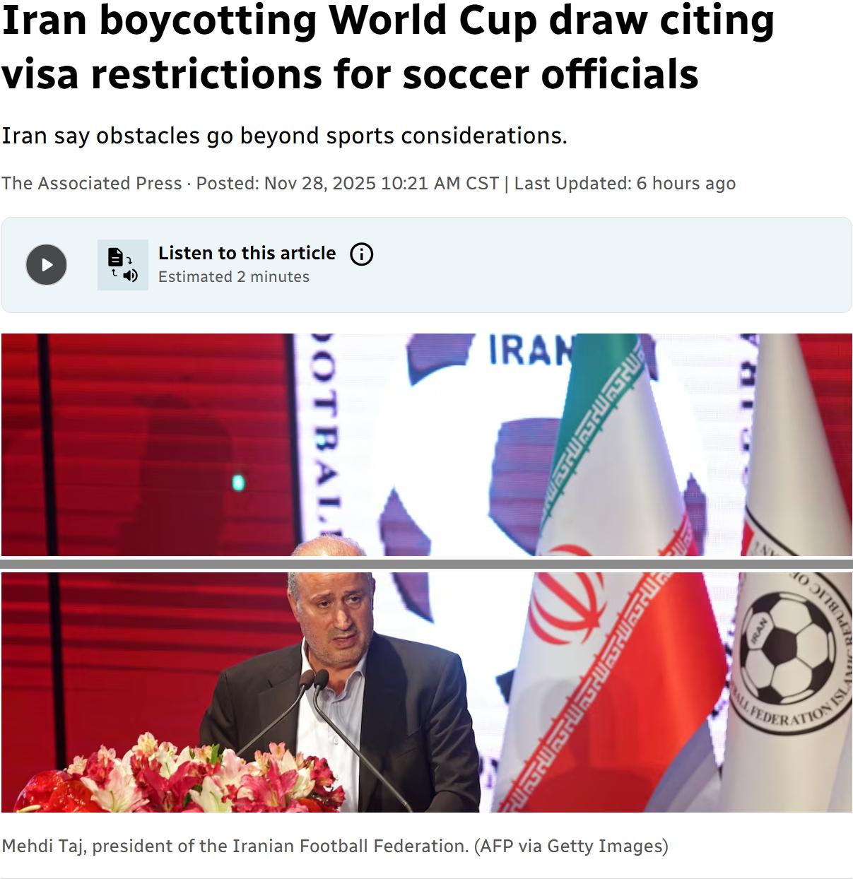 伊朗因足球官员签证限制抵制世界杯抽签 据伊朗国家通讯社IRNA周五报道,伊朗决定抵制下周在华盛顿举行的2026年世界杯抽签,原因是美国拒绝向其代表团成员发放签证。 伊朗足球协会发言人阿米尔-马赫迪·阿拉维表示,官员们面临的签证障碍超出了体育考量,足协已联系国际足联,希望能帮助解决问题,国际足联尚未回应。 特朗普总统政府此前于六月宣布对包括伊朗在内的12个国家公民实施旅行禁令。名单还包括上周获得世界杯参赛资格的海地。但禁令承诺对“任何运动员或运动队成员,包括教练、执行必要支持角色的人员及直系亲属,参加世界杯、奥运会或其他由国务卿决定的重要体育赛事而出征者”享有豁免。 目前尚不清楚这些豁免是否也适用于12月5日在肯尼迪中心举行的世界杯抽签。 伊朗代表团预计由其足球协会主席梅赫迪·塔吉领导,他是亚洲足球界最高级的官员之一,同时也是负责监督世界杯的两个国际足联委员会成员。他是亚洲足球联合会副主席之一,也是国际足联各委员会成员,负责该机构的各项赛事以及男子国家队足球事务。 明年6月11日至7月19日在美国、加拿大和墨西哥联合主办的世界杯将有创纪录的48支球队将参加。