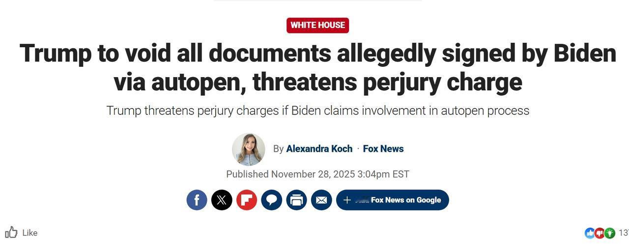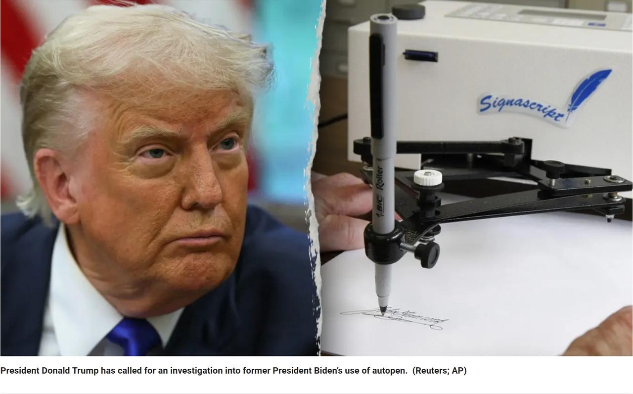特朗普将撤销拜登所有疑似通过自动笔签署的文件,并威胁拜登伪证罪指控 特朗普总统周五宣布,他将终止所有由前总统乔·拜登疑似使用自动笔签署的文件。 特朗普在Truth Social的一篇帖子声称拜登总统任期内签署的文件中有92%是通过自动笔完成的。 特朗普写道:“如果没有美国总统的特别批准,自动笔不允许使用。”他表示将取消所有行政命令以及“任何未直接由腐败的乔·拜登签署的文件,因为运营Autopen的人是非法的。” 自动笔装置能使用真实的笔和手写模板签名纸,能够高精度自动模拟个人签名。 自杜鲁门政府以来,美国政府一直使用自动笔,司法部法律顾问办公室此前也确认,只要经总统授权,总统签署立法和行政法案即可使用自动笔。 然而,特朗普声称拜登未批准这些签名,并威胁如果拜登声称自己参与了自动笔程序,将以伪证罪起诉他。 拜登任内签署了162项行政命令,以及数百份备忘录、公告和通知。 尽管特朗普在一月份签署了一项行政命令,废除了近80项拜登时代的行政命令,但其中一些似乎仍然有效,且可能被取消的,包括:第14087号行政命令,该命令降低了美国的处方药费用;以环境正义为核心的第14096号行政命令;以及第14110号行政命令,严厉打击人工智能(AI)的发展和使用。 目前尚不清楚谁将验证拜登所谓签署的文件上的签名。