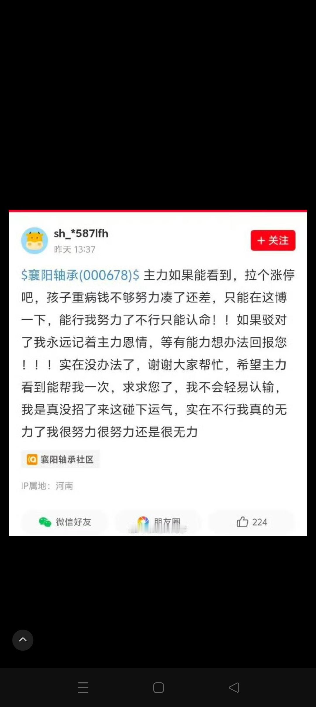 襄阳轴承的涨停,让我看到了人性之光,襄阳轴承的涨停,让我看到了人性之光,也让我更明白:这束光再亮,也照不亮你自己的账户,除非你自己成为那束光。江湖路远,与君共勉:信侠义,不迷侠义;有热血,更要有头脑。愿每个在股海中沉浮的游子,都能练就自己的绝世武功,不寄希望于人,只信手中三尺青锋。这才是"河洛侠"们该走的正道。