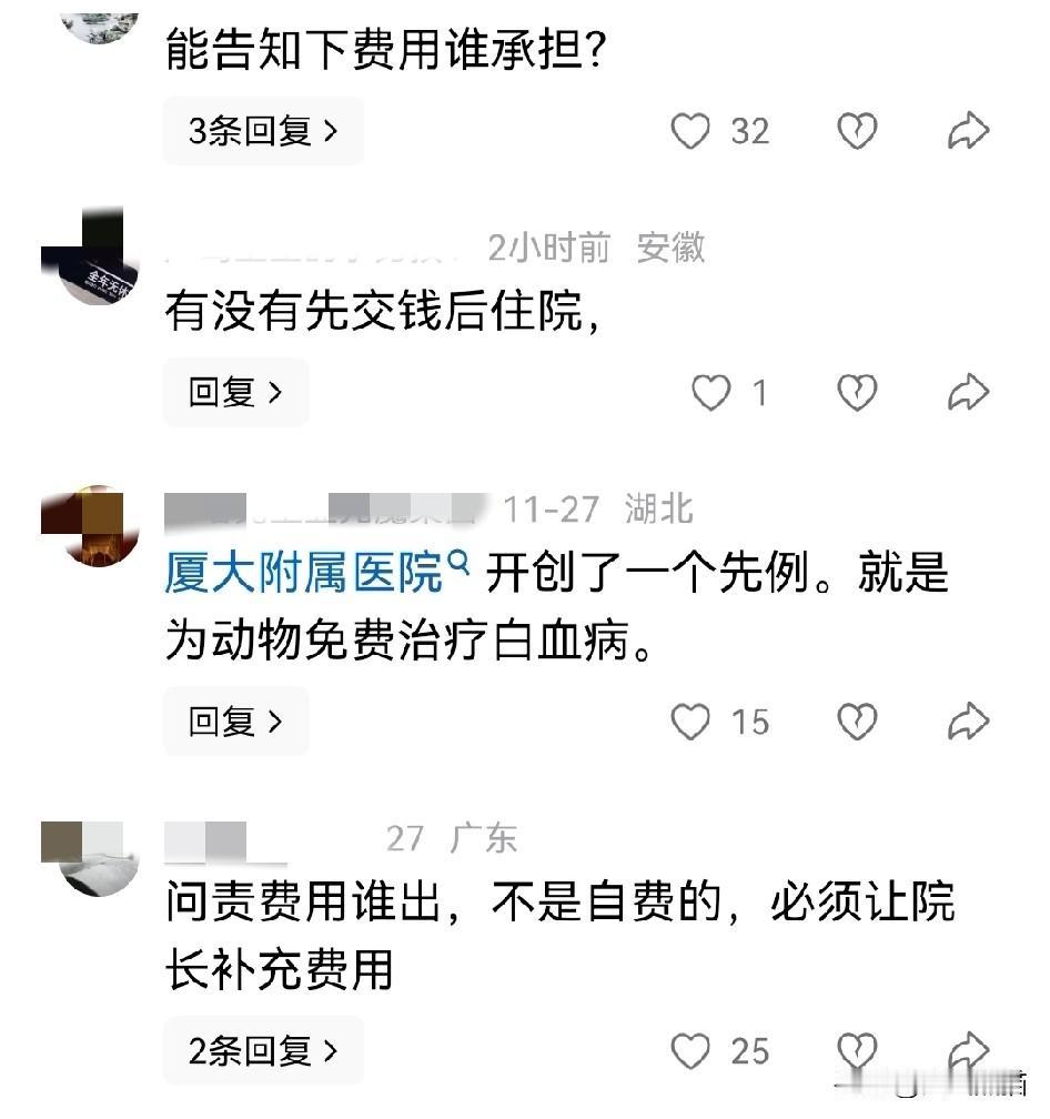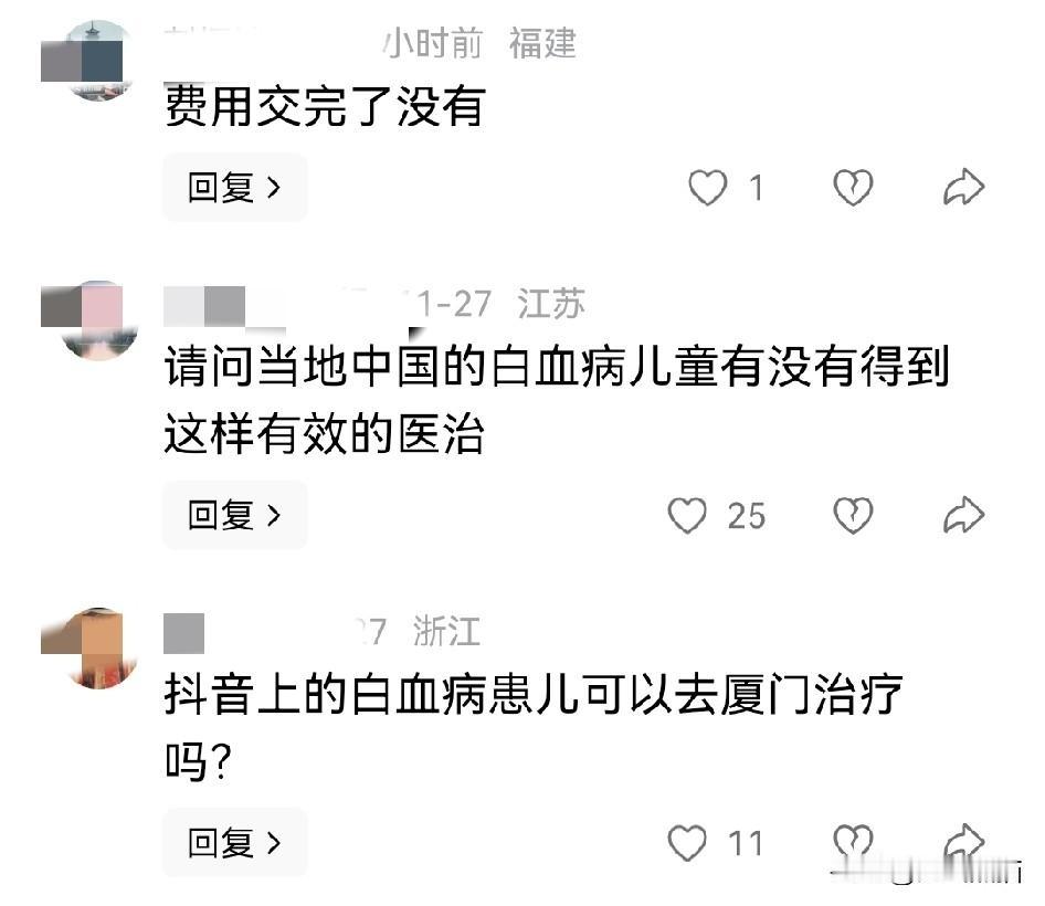 评论区有点不忍直视 厦门医院积极救治患白血病的留学生,及时成立专家团队成功将病情控制,本来是一件值得表扬的事,但是评论区却是画风突变。 大家都有一堆话要说。 看病的费用是由谁出的,是先交钱后住院吗,如果是我们国内的学生得了病能否获得同样的救治,经常刷到得了白血病的儿童因为家庭困难而无法及时救治,家长又卖车又卖房,借的七窟窿八债的,可以说是砸锅卖铁,这些孩子也应该得到帮助,希望厦门医院能够继续发扬救死扶伤的优良风格。