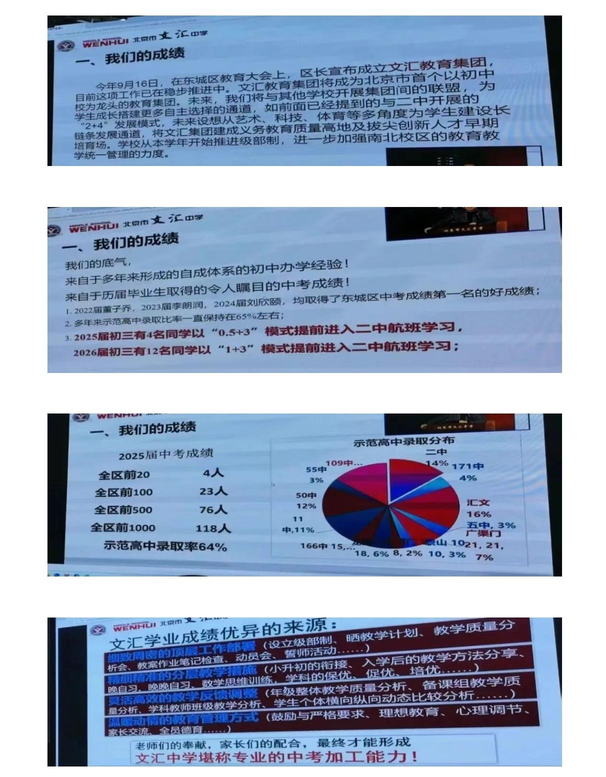 东城前三,妥妥的。前几天东城文汇中学开了家长会,会上官宣了自己2025年中考成绩,加工能力突出,先看图。 2025届中考,全区前20有4人、前100有23人、前500有76人、前1000有118人,示范高中录取率64%。 历届毕业生中考成绩突出,如2022届董同学、2023届李同学、2024届刘同学均获东城区中考第一名;示范高中录取比率多年保持在65%左右;2025届初三有4名同学以“0.5+3”模式、2026届有12名同学以“1+3”模式提前进入二中航班学习。 今年9月16日东城区宣布成立文汇教育集团,该集团以文汇中学为龙头,是北京市首个以初中为龙头的教育集团。第一个吃螃蟹的人,记住了。 未来将开展集团间联盟,搭建学生成长的自主选择通道,如与二中的“2+4”发展模式,还将从艺术、科技、体育等多角度建设长链条发展通道,打造义务教育质量高地和拔尖创新人才早期培育场,且从本学年推进级部制加强南北校区教学管理。 从家长的角度,这事儿挺好的: 首先让更多孩子在家门口享优质初中资源,缩小校际差距;然后小学到初中贯通培养,更早发现孩子特长,培养创新人才;再一个学生升学更顺畅,有更多发展机会。 站位更高一点,可以优化东城教育布局,还能给其他区办学提供参考。你们说是不是?