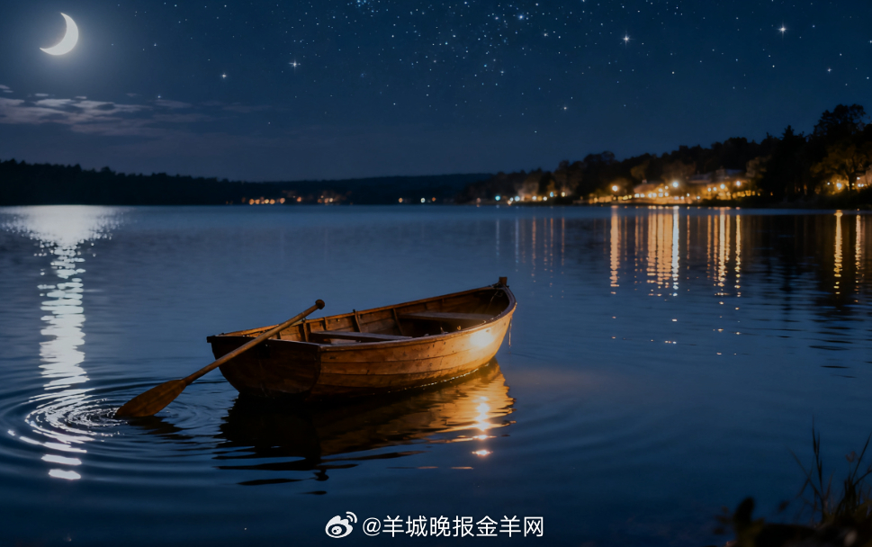 晚安 夜晚平静的湖面上,木船泛着微光,船桨轻划水面荡开涟漪,远处岸边灯火倒映湖中,夜空挂着弯月,星光点缀。