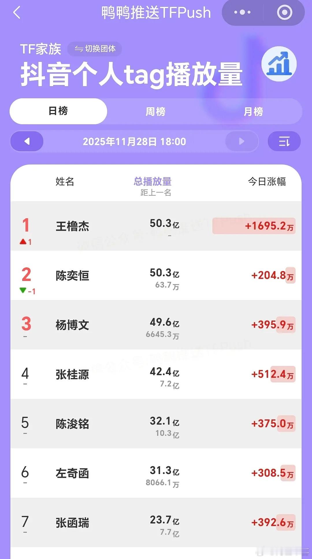 王橹杰超陈奕恒登顶抖音播放量第一了橹真成四代顶流了