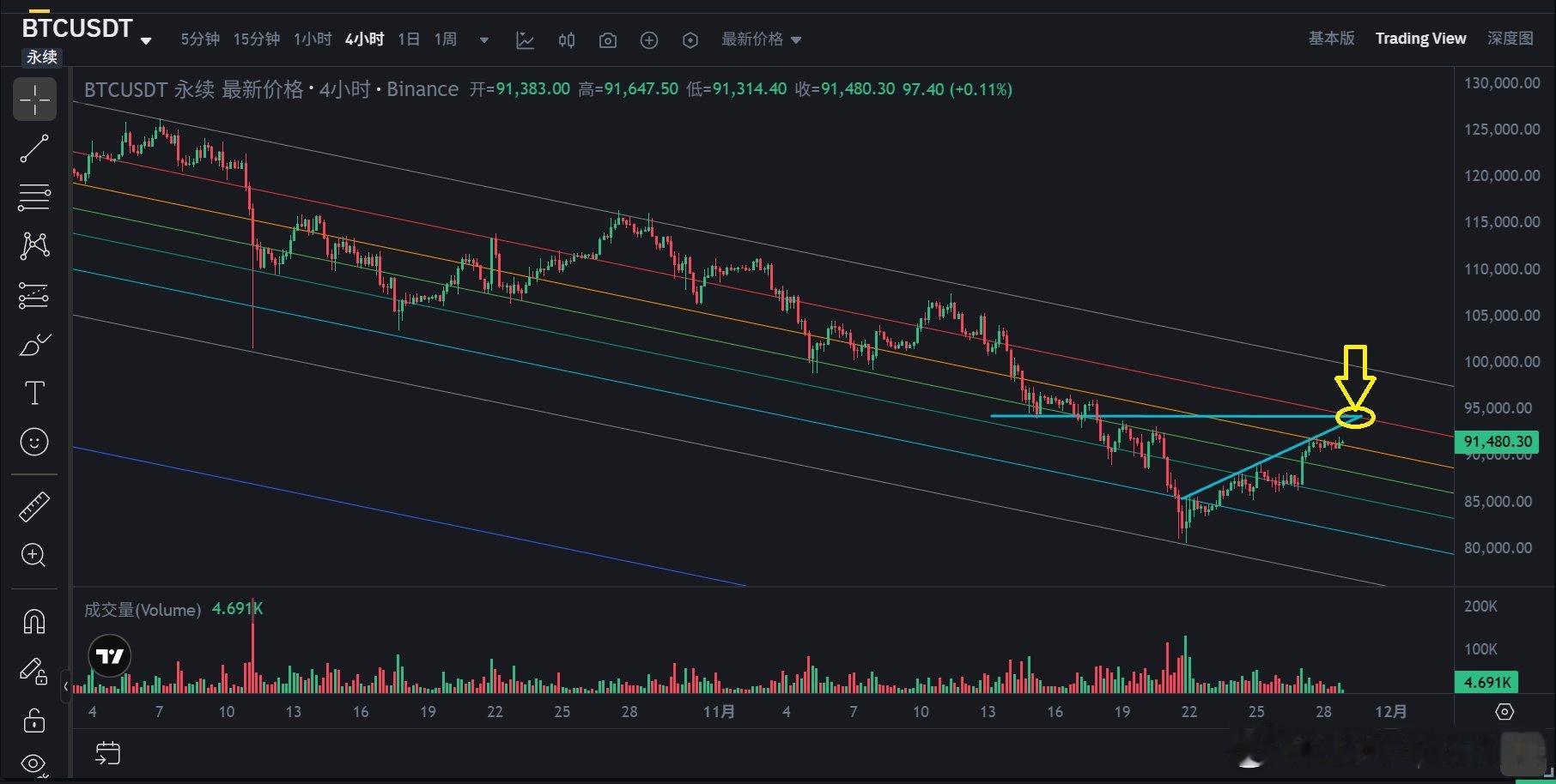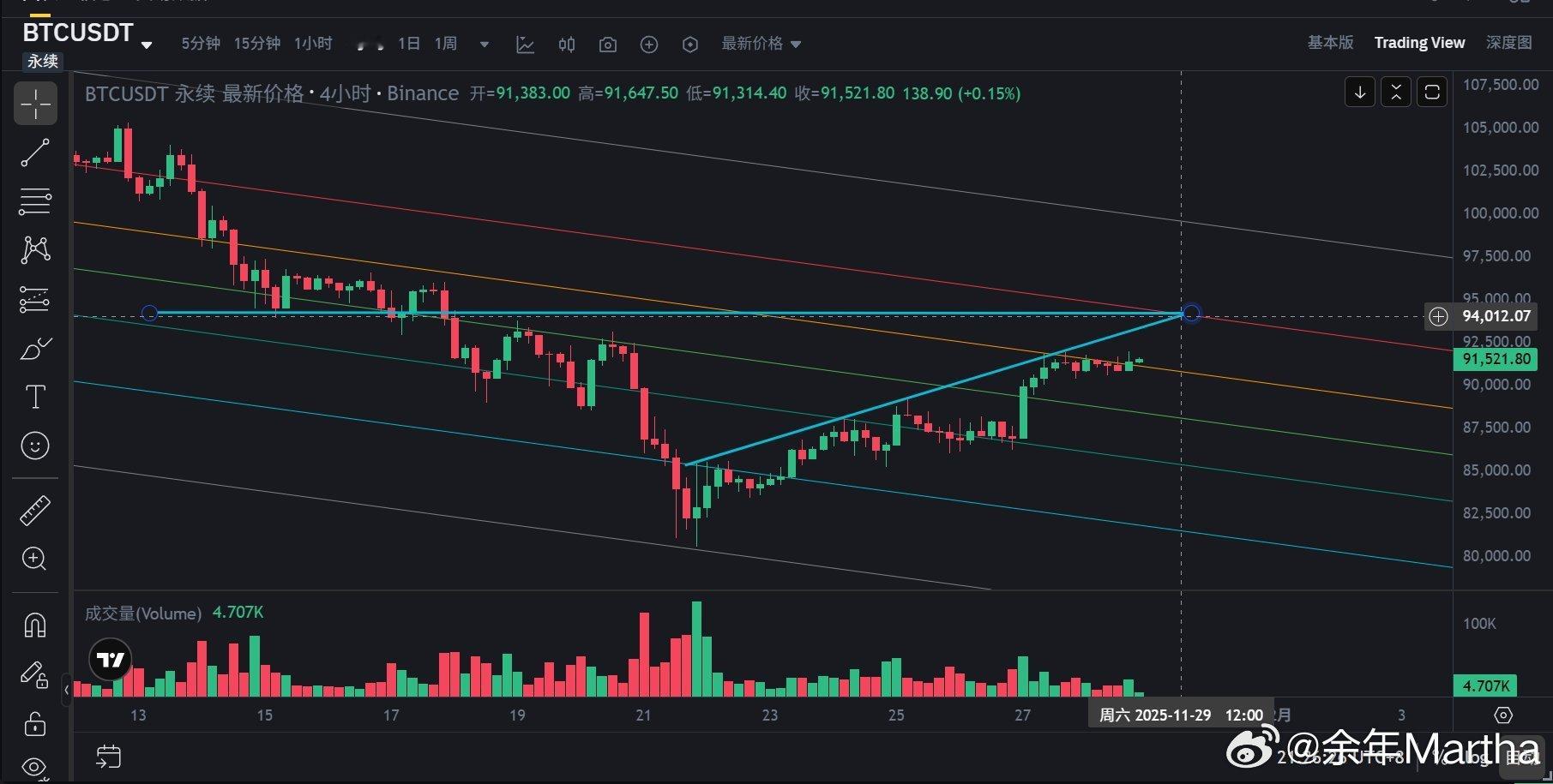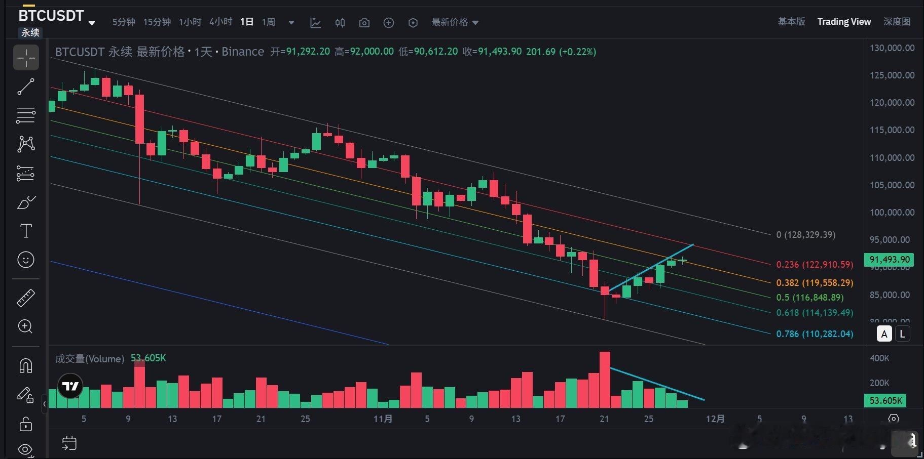 BTC 日线呈现量价背离,反弹快到尽头了!1)四小时:多头量能已衰减,空头量能未增强,空军在等待时机;2)价格有可能反弹到下降通道0.236位置即9.38万附近,也到了上方的成交密集区;3)日线:成交量已递减并呈现量价背离的情况,意味反弹行情将走到尽头了;4)订单薄上的委托卖盘金额开始堆积。