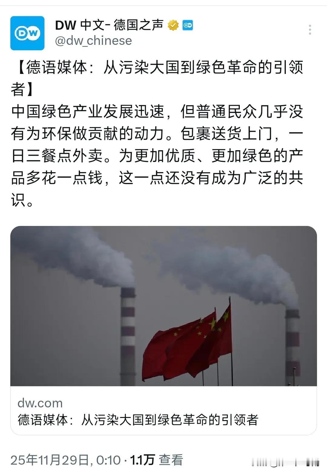 德国之声今天(11月29日)写道:“【德语媒体:从污染大国到绿色革命的引领者】中国绿色产业发展迅速,但普通民众几乎没有为环保做贡献的动力。包裹送货上门,一日三餐点外卖。为更加优质、更加绿色的产品多花一点钱,这一点还没有成为广泛的共识。” 评几句 德国之声这段评论,是典型的“站着说话不腰疼”。 把绿色转型简化为“老百姓不愿多掏钱”,就像把欧洲高通胀归咎于“德国人不爱买打折面包”一样荒谬。中国光伏板铺满全球屋顶、新能源车跑遍亚非拉,靠的不是“环保觉悟”,而是把绿电价格打到煤电以下、把电车成本做到油车水平——市场用钱包投票,比道德说教有效一万倍。 至于“外卖快递污染”?建议他们去柏林法兰克福看看,DHL黄背心、Deliveroo小绿袋同样堆成山。把现代化生活的共同特征单拎出来指责中国,不过是“环保”外衣下的双标老毛病。 说到底,绿色革命不是道德苦行,而是技术革命+规模革命。当中国把绿色产品做成“更好用+更便宜”时,某些媒体还在复读“多花点钱救地球”的过时经文——这既不是环保,也不是新闻,只是发达国家面对产业失守的优雅酸葡萄。