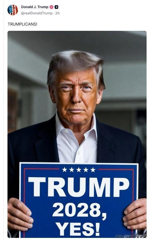 川普社媒新动态,他发布了一张自拍照,照片中他手举“川普2028”的标语。