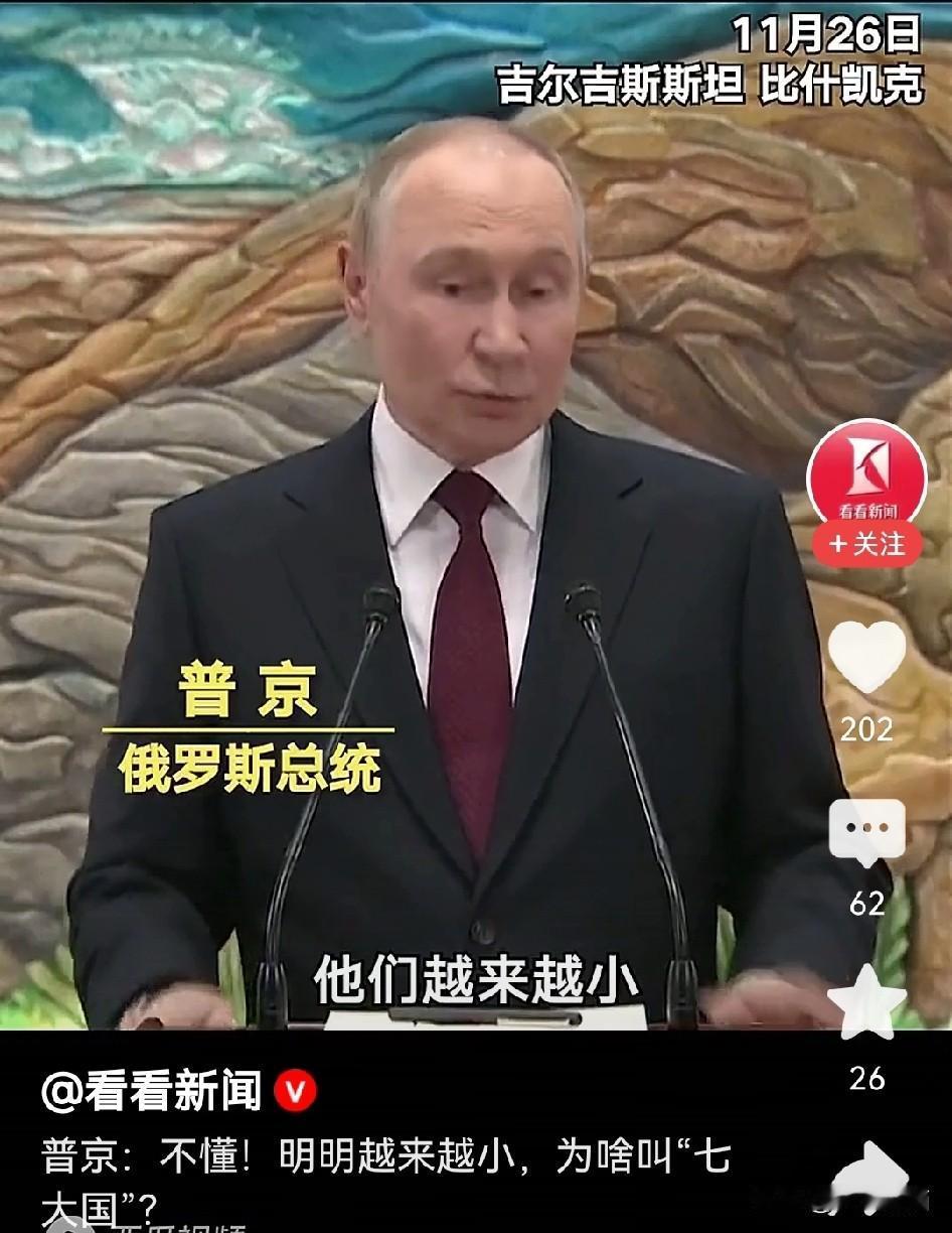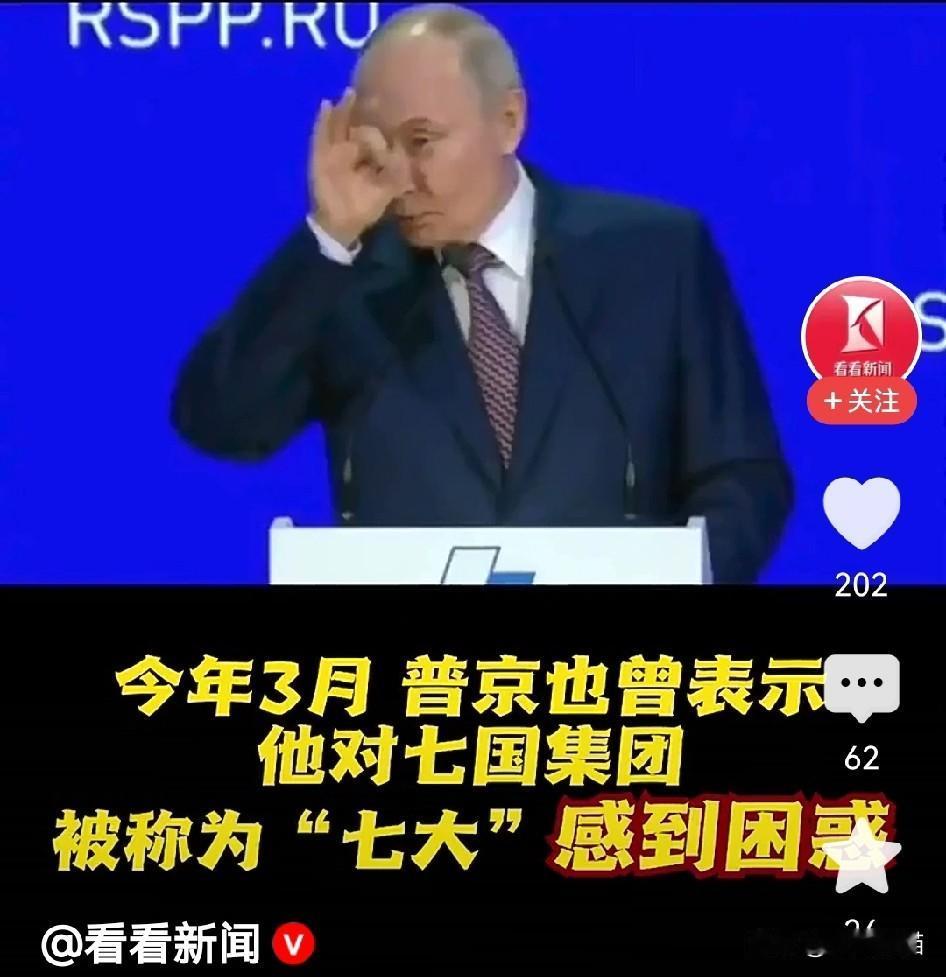 俄罗斯总统普京一句话扯下七国集团的遮羞布。 11月26日,普京在提及七国集团时,笑着调侃道为什么被称为七大国呢?他们在地图上不仔细看都很难被发现,就连引以为傲的GDP也在逐年的缩小,速度也在逐年降低。 这可不是简单的调侃,根据数据显示,包括美国在内的整个七国集团工业产值全部相加,还比中国的工业产值少了2.23万亿美元。 这也是俄罗斯并不看好七国集团的底气,七国集团正在逐步的走向没落,要想把俄罗斯重新拉回七国集团,看来普京是没有兴趣的,任何人都能看出,只有与中国,巴西等新兴国家加强合作才是出路。