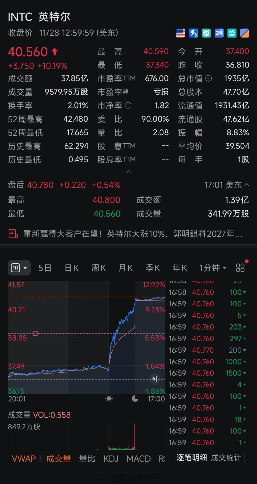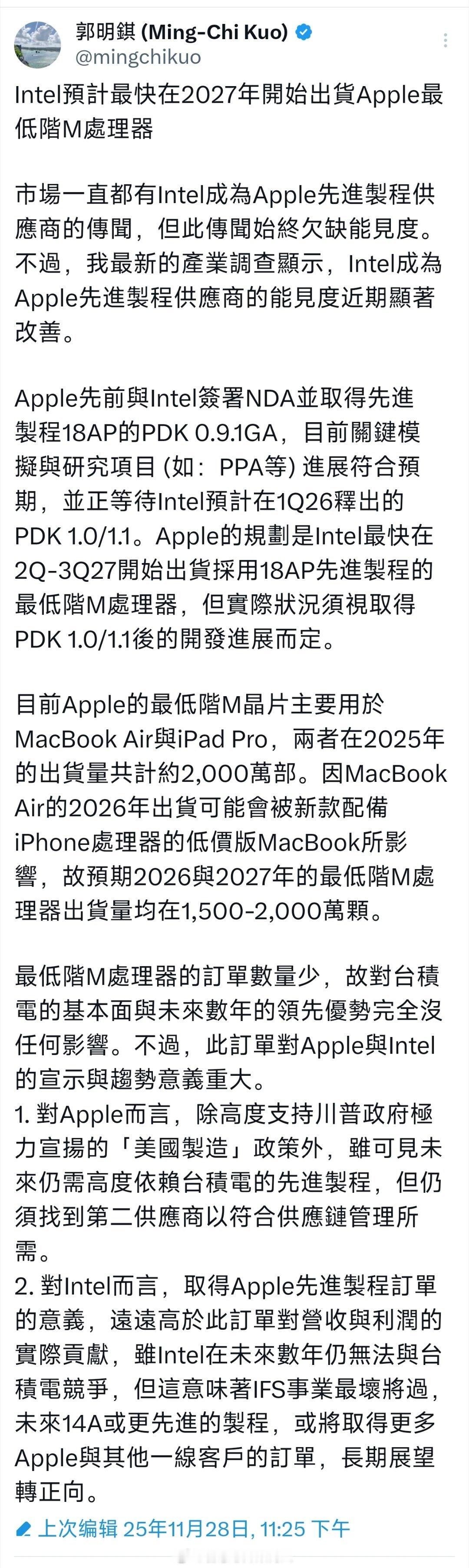 Intel因为郭老师一个帖子竟然暴涨10个点,说起来有点很难相信。看来郭老师的影响力还在。。。Intel 18A进苹果的可能性是有的,即使是最低端的M芯片,对台积电连续独占的苹果SOC市场也是撕开一个口子。台积电倒不用担心,2027年先进制程需求还是远大于供给的。