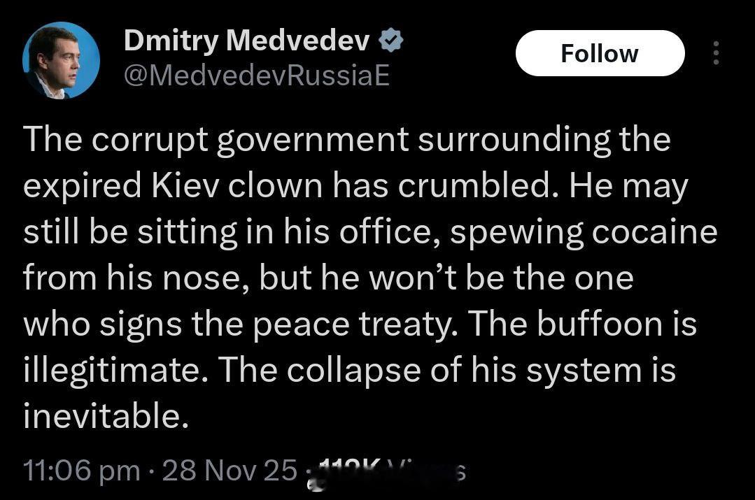 俄乌冲突 俄罗斯当代文豪梅德韦杰夫新作:围绕着那个过气的基辅小丑的腐败政府已经垮台了。他可能还坐在自己的办公室里,鼻子里喷着可卡因,但签署和平条约的不会是他。这个小丑是非法的。他的体系的崩溃已不可避免。—— 德米特里・梅德韦杰夫。普京宣布与乌克兰停火条件