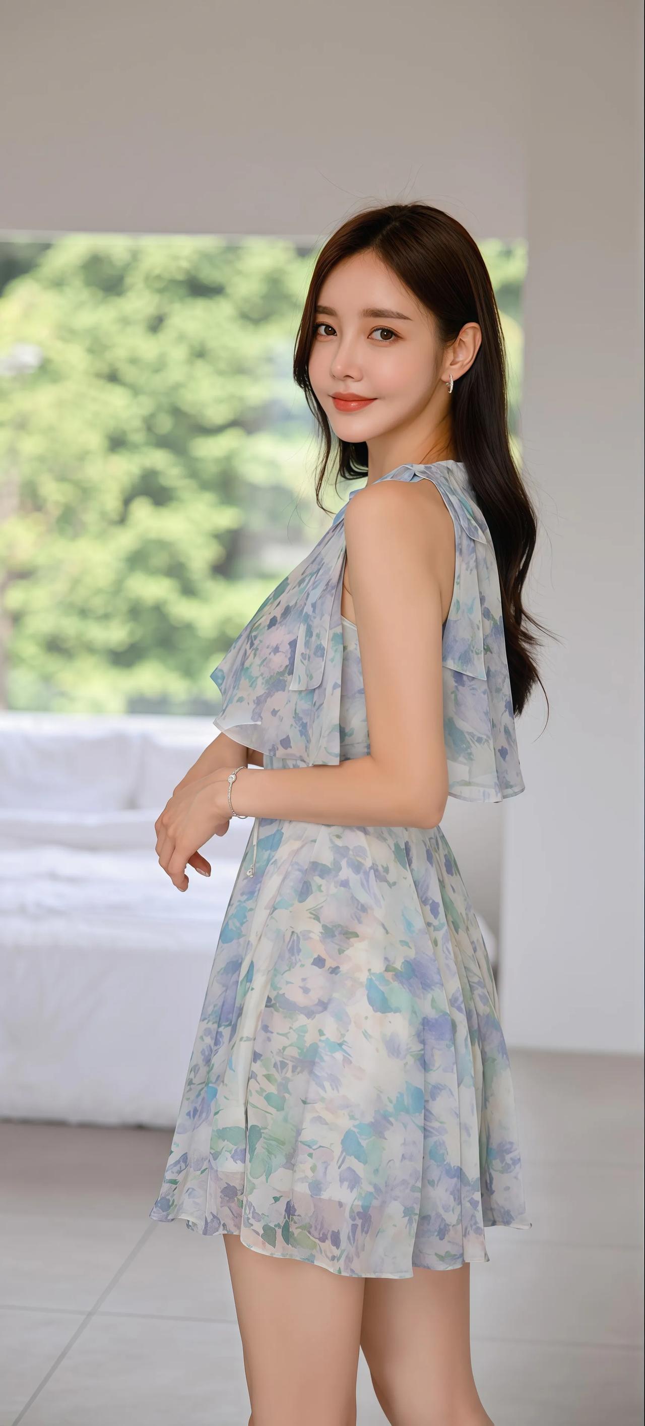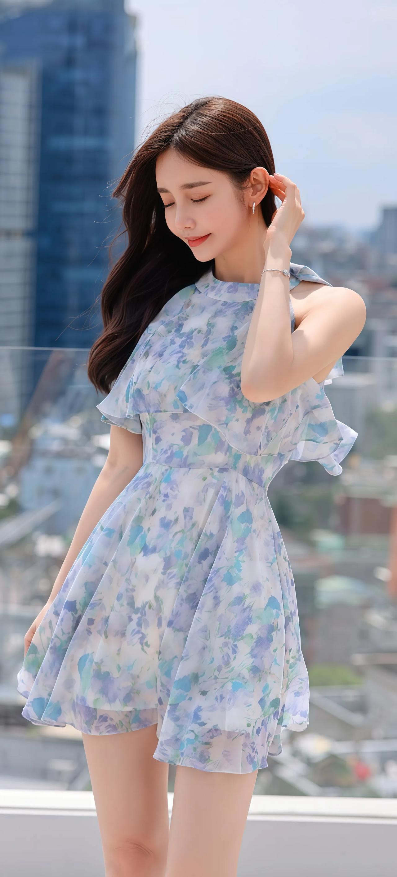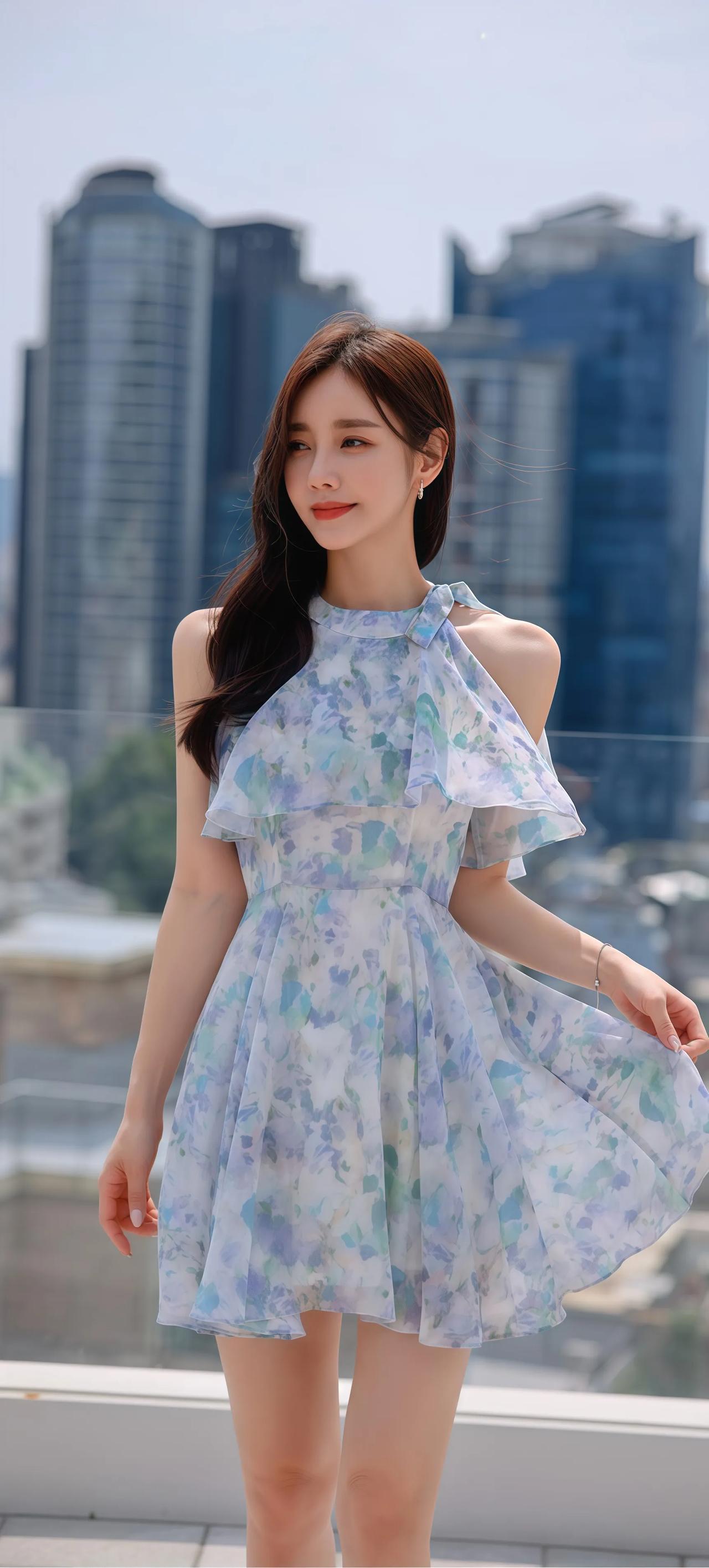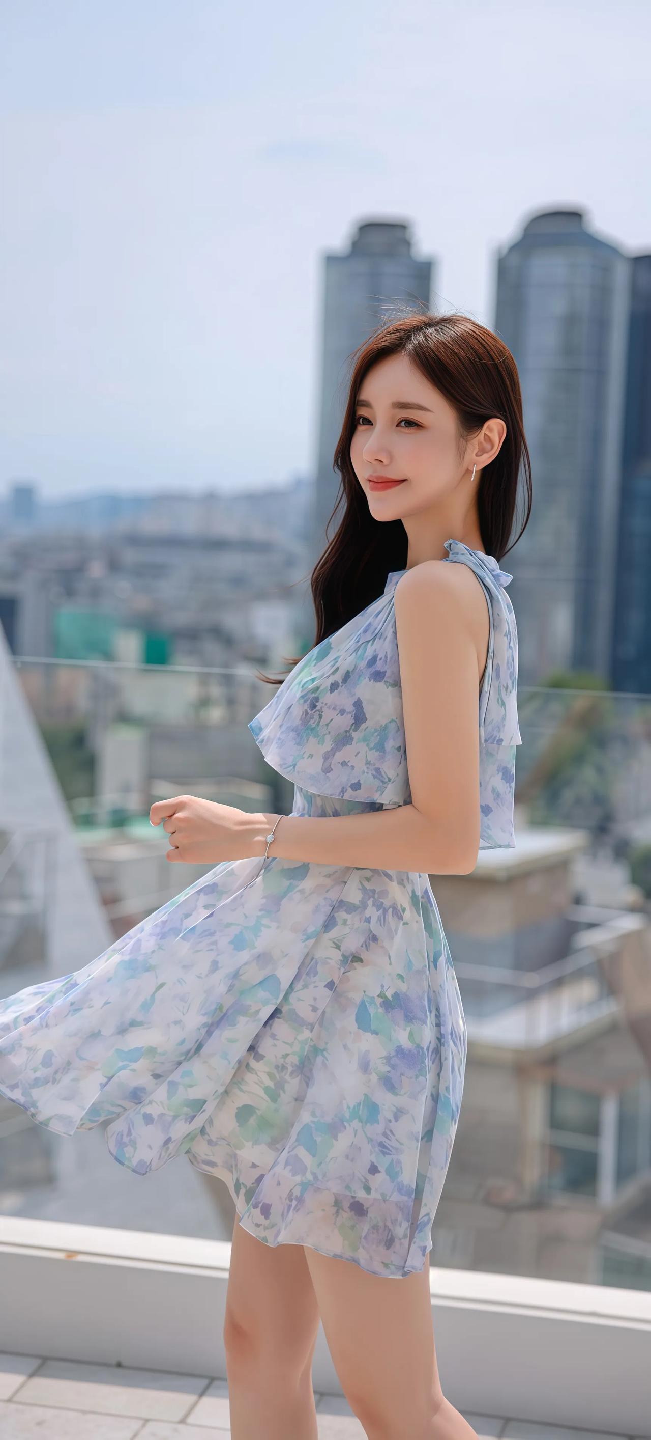 都市时尚女孩,轻奢连衣裙,都市天际线背景,优雅气质。