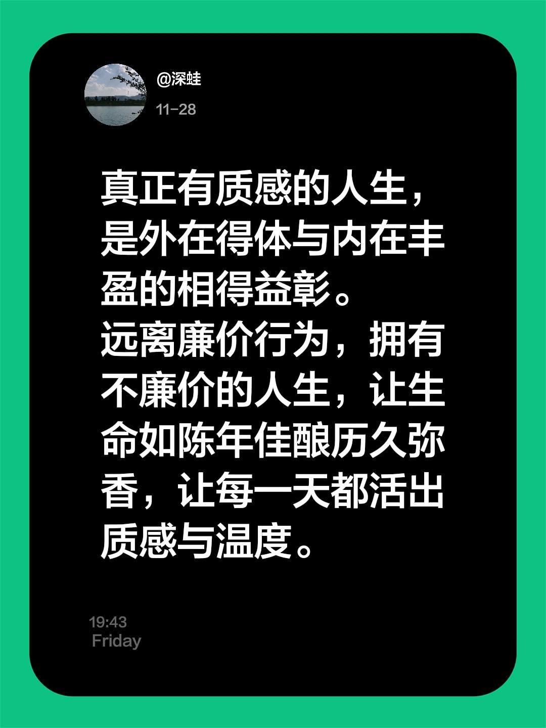 真正有质感的人生,是外在得体与内在丰盈的相得益彰。 远离廉价行为,拥有不廉价的人生,让生命如陈年佳酿历久弥香,让每一天都活出质感与温度。