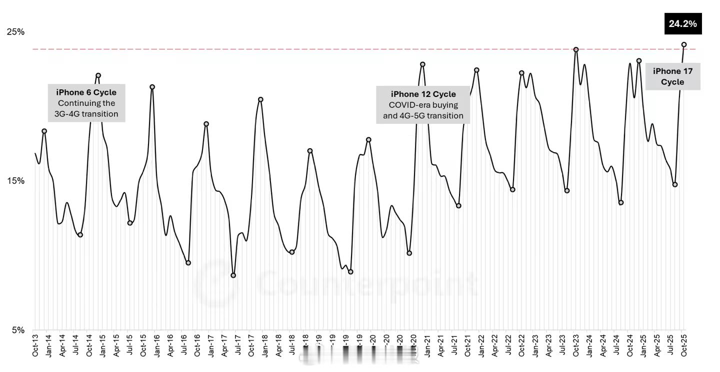 苹果 2025 年 10 月 iPhone 销量同比增长 12%,终端销量份额飙升至 24.2%,创下历史新纪录。上市后六周表现上,iPhone 17 系列全面超越了去年的 iPhone 16 系列。