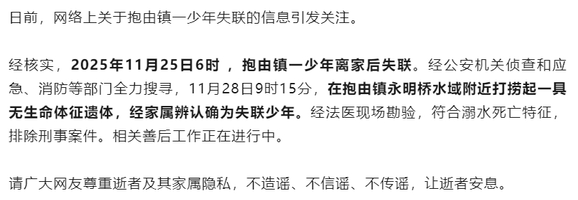 #海南黎族失联少年遗体已找到#【官方通报:已找到海南失联少年遗体】昨日(11月28日)22时许,海南乐东黎族自治县应急管理局发布一则情况通报:日前,网络上关于抱由镇一少年失联的信息引发关注。经核实,2025年11月25日6时 ,抱由镇一少年离家后失联。经公安机关侦查和应急、消防等部门全力搜寻,11月28日9时15分,在抱由镇永明桥水域附近打捞起一具无生命体征遗体,经家属辨认确为失联少年。经法医现场勘验,符合溺水死亡特征,排除刑事案件。相关善后工作正在进行中。请广大网友尊重逝者及其家属隐私,不造谣、不信谣、不传谣,让逝者安息。