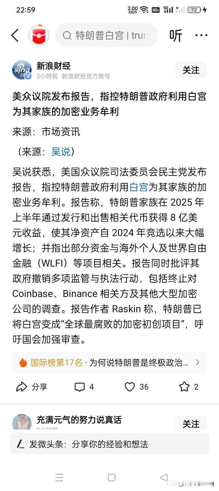 沾上这种事大麻烦? 在西方的资本主义国家,如果是沾上政治的事情,问题反而很可能并不大。但是,如果是沾上经济、或者说金钱的事情,那问题可能就大了。 据网络上有消息说,美国众议院司法委员会民主党发布报告称,特朗普政府利用白宫为其家族的加密业务牟利。报告指控,在2025年特朗普家族的八亿美元收益中的部分资金,与海外个人账户和世界自由金融有关。与此同时,白宫似乎撤销了多项对金融事务的监管和执法行动。 在美国这个国家,好像不管是总统、还是其他的政府官员,假如一旦与钱扯上关系和麻烦,问题似乎立马就上纲上线去了。 但是,如果说特朗普利用职权为其家族谋利益,可不是一件小事情,必须要有充分的证据,应该不是仅仅说说那么简单。而且,作为一个争议不断的人,也万万不会轻易授人以柄,留下马脚的可能性微乎其微。