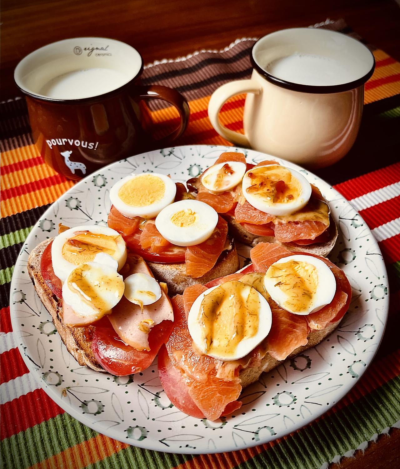 大吐司烤焦了点,不过不影响吃,抹上黄油更香。俺闺女还有加抹果酱,太甜了俺不敢吃。