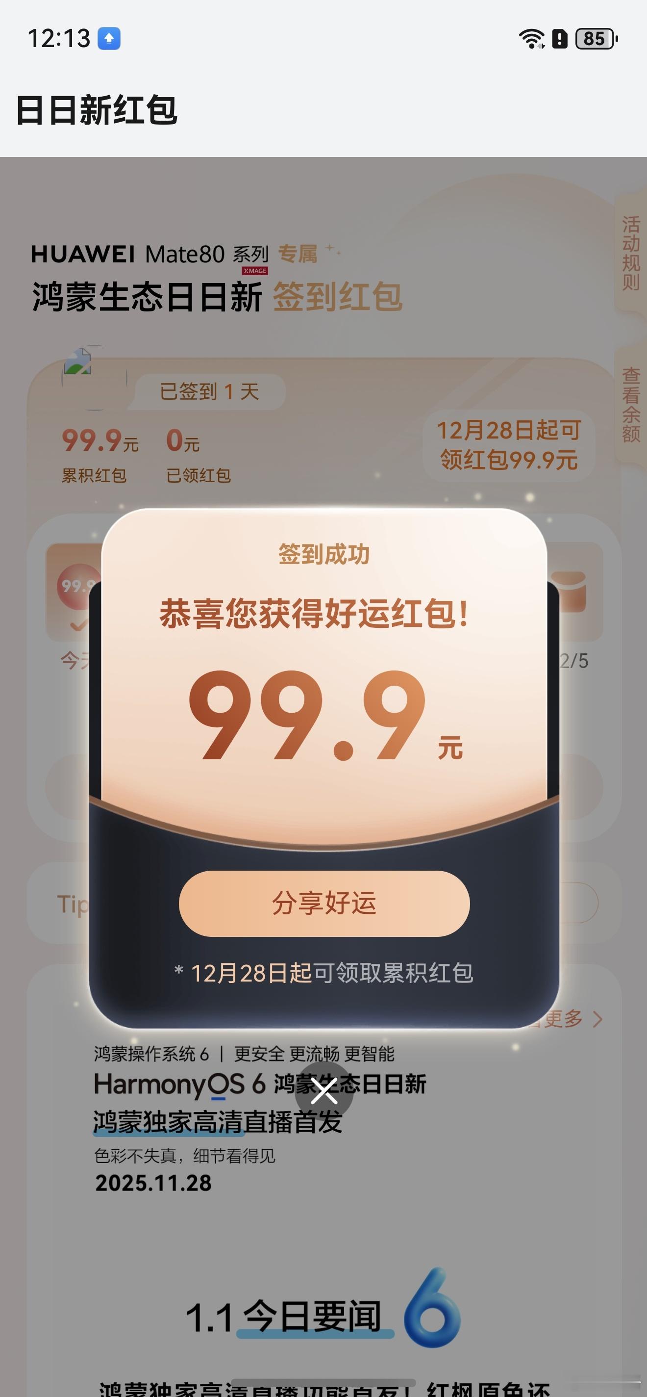 哇!我的 Mate 80 Pro Max 领鸿蒙日日新红包,领到 99.9 元