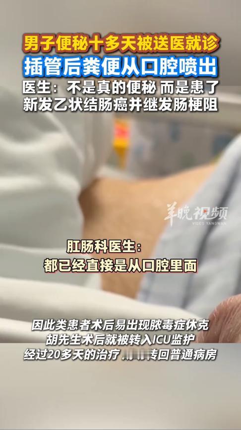 悲剧还是发生了!2025年10月,广东深圳,一老人长期便秘但没有重视,眼见肚子一天天的膨胀,最后才让家人送去医院治疗,结果医生发现老人并不是便秘,而是结肠癌,手术过程中,粪便竟从老人嘴里喷出来!网友:太有画面了! 便秘确实是个难言之隐,现在不仅是老年人,很多人由于饮食不健康,不喜欢吃蔬菜,时间一长也会便秘,但有时引起便秘的原因却是癌症,所以大家一定要及时就医检查。 随着年龄越来越大,胡大爷感觉肠胃总是不舒服,还伴随着隐隐的阵痛,之后就开始便秘。但是胡大爷并没有重视,认为这是人老了之后的正常现象。 可是胡大爷的肚子却变得越来越大,十多天后,胡大爷也是有些害怕了,就让家人带自己去医院检查下,没想到还真的查出了大问题! 原来,让胡大爷便秘的罪魁祸首,是结肠癌,肿瘤将肠管堵死,所以才无法排便的,而且肠管还出现充血症状,情况不容乐观。 医疗团队立即安排了手术,没想到在插管过程中,胡大爷体内的粪便竟从嘴巴里吐了出来,这让医生都始料未及。好在经过20多天的治疗,胡大爷已经转危为安。 所以大家日常生活中身体出现不适后,要及时的去医院治疗,千万不要在家里硬拖,很多大病都是被硬生生拖出来的! 信息来源:《男子便秘十多天插管后粪便从口腔喷出……医生提醒!》光明网