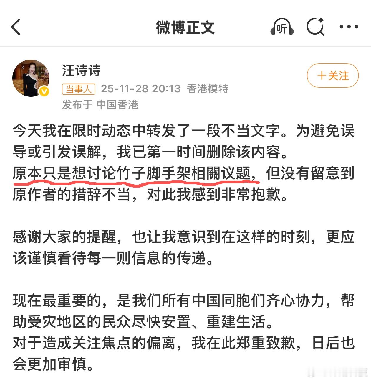 甄子丹老婆ins发文,然后微博道歉。所以,是真的有很多香港人认真地觉得竹子脚手架不易燃,这次火灾跟竹棚没关系......
