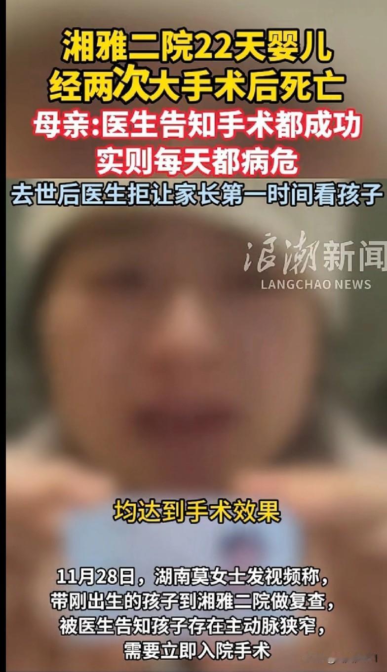 22天宝宝两次手术后没了,妈妈的话让人扎心 这事儿看得我心都揪紧了——22天的新生儿,在湘雅二院做了两次手术,妈妈一直被说“手术成功”,结果孩子每天都在病危,最后没了,连第一时间看孩子都被拒。 11月28日莫女士发的视频里,那语气又痛又懵:刚生的娃复查查出主动脉狭窄,紧急入院手术,结果等来的是“成功”后的噩耗。 这么小的宝宝,刚来到世上就要遭这么大罪,最后连好好告别的机会都没给家长,换谁能扛得住啊? 现在就盼着能查清真相,给这对父母一个交代,也别让更多家庭受这种苦了。