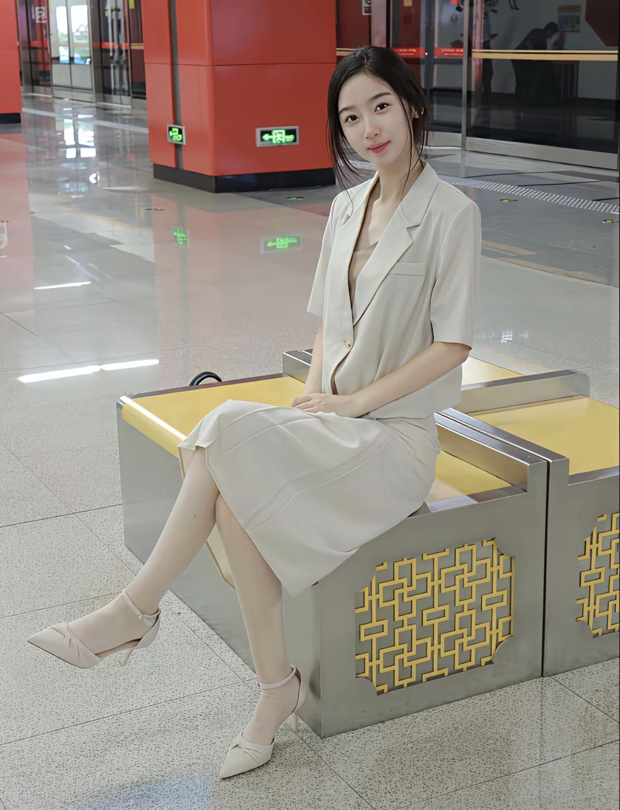 小姐姐坐在地铁站长椅上,好有气质!地铁上女子 地铁上的坐姿 地铁时尚阿姨 湖边长椅美照