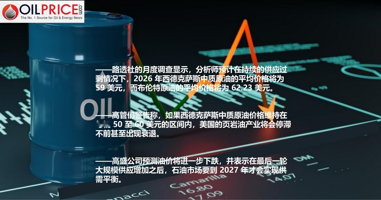 华尔街警告称 2026 年石油过剩状况将加剧,油价将进一步下跌 11月28日,路透社对分析师和经济学家的月度调查结果显示,供应过剩的市场将使明年油价持续承压,美国基准油价平均将低于每桶 60 美元。 根据对 35 位分析师和经济学家的调查,2026 年美国基准原油(即西德克萨斯中质原油WTI)的平均价格预计为每桶 59 美元。这一价格低于上个月调查中预测的每桶 60.23 美元。 分析师们预计,作为国际基准的布伦特原油明年均价将为每桶 62.23 美元,低于 10 月份路透社调查所预测的 63.15 美元。 大多数专家认为,欧佩克+和非欧佩克+产油国产量的增加是明年油价下跌的主要因素。但分析人士认为,持续存在的地缘政治风险可能会为油价提供一定的支撑。 行业高管表示,以目前的西德克萨斯中质油价格计算,页岩油产量将会停滞不前甚至开始下降,而页岩油生产商则希望通过提高生产效率和资本配置来实现增产和降低成本的目标。 康菲石油公司的董事长兼首席执行官瑞安·兰斯表示:“如果西德克萨斯中质原油的售价维持在每桶 60 至 65 美元的水平,那么美国的石油产量可能就会趋于稳定了。” 这位高管补充道:“但如果价格保持在 60 美元,或者进一步降至 50 多美元,那么很可能就是进入了停滞期或者略有下降的趋势。” 本月早些时候,高盛公司表示,由于市场供应过剩,油价将从当前水平进一步下跌至明年,预计 2026 年西德克萨斯中质原油的平均价格为每桶 53 美元。 高盛集团全球大宗商品研究部门的联合主管达恩·斯特鲁文上周在接受美国消费者新闻与商业频道采访时表示,2027 年石油市场将实现重新平衡,因为 2026 年将是“市场需要应对的最后一轮大规模石油供应高峰”。 斯特鲁文表示,从长远来看,石油供应的增长主要将来自欧佩克组织,因为该组织拥有闲置产能,并且正在加大产能扩张的投入力度。 美国的页岩油产区或许能带来些许增长,但据高盛公司预测,这需要到2030年末布伦特原油价格维持在每桶约 80 美元左右才行。