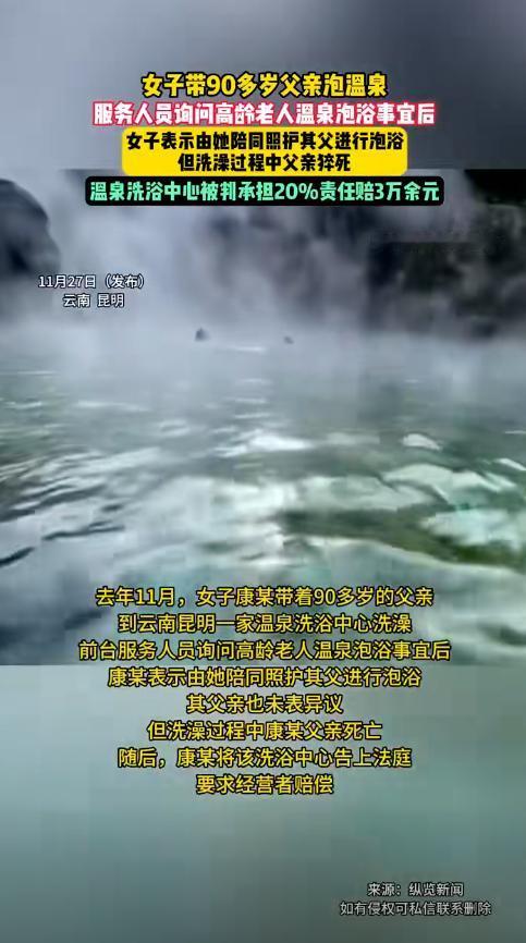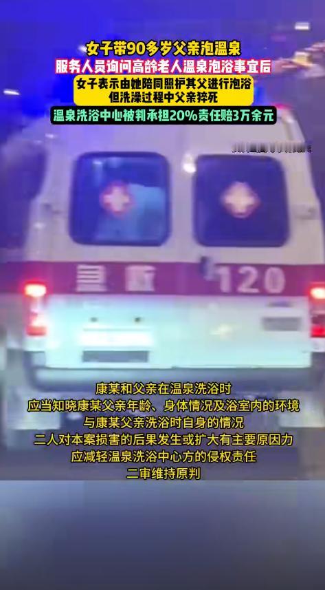 云南昆明,女子带90多岁的父亲到温泉洗浴中心泡澡,买票前,女子明确表示,她会全程陪同并照顾父亲。谁知,进去没多久,老人就出意外,尽管工作人员第一时间拨打了急救电话,但老人还是不幸去世。女子认为,父亲的悲剧洗浴中心应该负责,便将店家告上法庭,要求赔偿。洗浴中心觉得很冤枉,但法院的判决让人意外。 据石家庄普法11月27日报道,事情得从去年11月份说起,那天下午,一个中年女子搀着一位白发苍苍的老人走进了店里。 女子姓康,老人是她九十多岁的父亲,前台小姑娘一看老人这年纪,立马就警惕起来,赶紧把高龄老人泡温泉的风险仔仔细细说了一遍,什么心脏负担加重、容易头晕之类的。 康女士听完,摆摆手说没事,她爸身体还行,就是想来放松一下,而且她会全程陪着,一步都不会离开。 李老板当时正好在前台,听到康女士这么保证,才点头同意卖票,收了120块钱,安排服务员把父女俩带进了一个独立的包间。 谁也没想到,半个多小时后,意外就发生了,浴区里突然传来了康女士惊慌的呼救声,正在附近巡查的两名员工听到动静,想都没想就冲了进去。 只见老人已经瘫倒在池边,脸色发青,没了呼吸,情况紧急,一个员工立马按照培训过的急救知识,把老人抬到旁边的休息床上放平,开始做心肺复苏,另一个员工则飞快地跑去拿急救箱,同时拨打了120急救电话。 整个过程,没有一丝一毫的耽搁,李老板闻讯赶来时,急救车也呼啸而至,医护人员接手抢救了二十多分钟,但最终还是没能把老人从鬼门关拉回来,老人因心源性猝死,不幸离世。 警察来了之后,调取了监控,询问了当事人和所有在场的人,最后给出的结论是排除了他杀,老人属于自然死亡。 李老板当时觉得,虽然发生了不幸,但店里该做的都做了,也尽到了责任,这件事应该就算过去了,可让他万万没想到的是,一个月后,他竟然收到了法院的传票。 康女士把他告了,理由是洗浴中心没有提供一个安全的环境,导致她父亲死亡,要求赔偿死亡赔偿金等各项费用共计十八万多元。 李老板拿着起诉书,又气又委屈,他觉得自己比谁都冤,开门做生意,风险提示贴得到处都是,员工急救培训证书也都有,监控视频清清楚楚地记录了员工第一时间冲进去救人,怎么就成了没提供安全环境了? 法庭上,李老板把所有证据都摆了出来,但康女士的律师却提出了一个让他意想不到的问题:洗浴中心的消防许可证是上一任店主留下的,李老板接手后并没有重新办理。 不仅如此,法院委托的专业机构勘验后还发现,浴区的通风系统风速,没有达到行业规定的安全标准,这两点,成了李老板的“致命伤”。 他当时就懵了,接手店的时候,前店主说证件还在有效期,能继续用,他就没多想,通风的问题,平时客人都没反映过闷,怎么就跟老人猝死扯上关系了?这在他看来,简直是强行找茬。 法院审理后认为,老人九十岁高龄,本身就是心脑血管疾病的高危人群,在温泉这种高温高湿的环境里,风险会更大。 他自己和作为陪同家属的康女士,对这个风险预估不足,应该承担主要责任,这一点,李老板是认同的,但是,法官话锋一转,指出经营者对顾客的安全保障义务是全方位的。 根据法律规定,像洗浴中心这种公共场所,换了老板就必须重新申请消防许可,这是开业经营的硬性条件,通风系统不达标,也确实属于安全隐患。 虽然这两点不是导致老人猝死的直接原因,但它们证明了洗浴中心的经营环境本身就存在缺陷,没有完全尽到安全保障的义务。 最终,一审法院判决,洗浴中心需要承担20%的次要责任,赔偿康女士一家三万六千多元,李老板不服,他觉得这个判决太不讲理了,明明是意外,怎么能因为一个证件、一个通风就把责任扣到他头上?他坚决上诉到了中级法院。 然而,二审的结果并没有改变,法院认为一审判决事实清楚,法律适用准确,驳回了上诉,维持原判。 其实,这个案子给所有开门做生意的人都上了一课,法律对经营者的要求,不仅仅是事后补救,更重要的是事前预防。 你的经营场所必须是百分之百合规的,不能有任何侥幸心理,消防许可、通风设施这些看似和顾客猝死没有直接关联的东西,在法律上却被视为保障顾客安全的大前提。 只要这个前提不存在,哪怕你事后做得再好,一旦出了事,这个责任你就跑不掉。 老板最后还是不情不愿地赔了钱,然后立马关店整改,把新的消防许可证办了下来,通风系统也全部换新,只是,这件事在他心里留下了一个大大的疙瘩。 他觉得自己尽了最大的努力去救人,却因为一些自己没太在意的“小问题”而赔钱担责,这个教训,实在太过深刻,也太过憋屈。 信源:石家庄普法2025-11-27——女子带90多岁父亲泡温泉 服务人员询问高龄老人温泉泡浴事宜后 女子表示由她陪同照护其父进行泡浴 但洗澡过程中父亲猝死 温泉洗浴中心被判承担20%责任赔3万余元