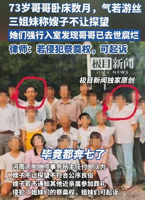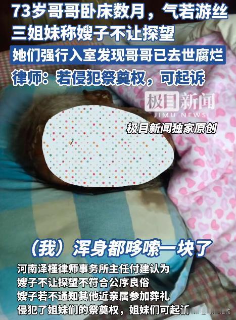 天津,张女士73岁的哥哥和嫂子一起生活,几个月前,张女士给哥哥打电话,察觉哥哥说话有气无力,放心不下便想去探望,却遭嫂子拒绝。从邻居处得知哥哥半年前就卧床不起,张女士和两个姐妹再次前往探视时,嫂子依旧不让进,还让她们下午再来,下午姐妹仨返回,好说歹说进了家,嫂子又拦着不让进哥哥的房间,她们强行开门后,发现哥哥已去世多日,尸体腐烂,吓得赶紧报了警。目前哥哥遗体在殡仪馆,她们等尸检报告,连葬礼时间都不确定,还担心嫂子不让参加,记者联系嫂子及其女儿时,都被拒绝。 张女士有个73岁的哥哥,一直和嫂子李某生活在一起。 原本一家人虽不常见面,但亲情关系一直还不错。 几个月前,张女士像往常一样给哥哥打电话,电话那头哥哥的声音微弱得像风中残烛,气若游丝。 张女士担心哥哥身体出了大问题,便决定上门看望。 可当她赶到哥哥家,嫂子李某却死活不让她进门,还找各种理由推脱。 张女士心里犯起了嘀咕,从邻居那打听到,哥哥半年前就已经站不起来了,只能卧床养病。 11月18日上午,张女士实在放心不下哥哥,便和两个姐妹一同前往哥哥家。 到了门口,嫂子还是那副拒人于千里之外的模样,不仅不让她们进门,说话还怪里怪气,甚至围着房子转了三圈,让她们下午再来。 姐妹仨满心疑惑,却也只能先离开。 下午,姐妹仨再次返回哥哥家。 好说歹说,嫂子终于让她们进了家门,可当她们想进哥哥房间时,嫂子又横加阻拦。 姐妹仨顾不上那么多,强行打开了哥哥的房门。 然而,眼前的景象让她们瞬间崩溃,哥哥早已去世多日,尸体已经开始腐烂,散发着刺鼻的气味。 姐妹仨吓得脸色苍白,赶紧报了警。 如今,哥哥的遗体还停放在殡仪馆,姐妹仨只能焦急地等待尸检报告,连葬礼什么时候举行都不知道,还担心嫂子会阻止她们参加。 记者尝试联系嫂子李某,电话始终无法接通,她女儿也不方便接听。 嫂子的行为,实在让人难以理解。亲人之间本应相互扶持、关爱,可嫂子却长期阻拦张女士等人探望哥哥,哥哥去世后还任由遗体腐烂在家中。 那么以法律分析,嫂子是否要为自己的行为承担责任呢? 虽然法律没有明确规定兄弟姐妹之间有探望权,但从道德和亲情层面讲,张女士兄妹探望哥哥是合情合理的,这种探望,能让亲人之间感受到关怀。 如果嫂子故意让哥哥的遗体腐烂,这就可能触犯侮辱尸体罪。 《刑法》第三百零二条规定,盗窃、侮辱、故意毁坏尸体、尸骨、骨灰的,处三年以下有期徒刑、拘役或者管制。 嫂子在哥哥去世后,没有及时处理遗体,任由其腐烂,这种行为,会被认定为对尸体的不尊重和侮辱。 警方介入调查后,会结合尸检结果以及嫂子的主观意图,来认定她是否构成此罪。 要是嫂子不是故意的,因一些特殊原因无法及时处理遗体,那情况又会不同。 祭奠权,包含亲属及时知晓逝者去世消息,并能够及时进行祭奠活动的权利。 嫂子的隐瞒行为,使得张女士等姐妹无法在第一时间得知哥哥去世的事实,从而无法按照传统习俗和内心意愿及时开展祭奠活动,严重侵犯了她们的祭奠权利,让她们失去了与哥哥最后告别的重要时机,给她们带来了巨大的精神痛苦。 张女士等姐妹担心嫂子会阻止她们参加哥哥的葬礼,葬礼是亲属对逝者进行集体祭奠、表达哀思的重要仪式,是祭奠权行使的关键环节。 嫂子若真的阻止她们参加葬礼,将彻底剥夺她们通过葬礼这一重要形式来缅怀哥哥、寄托哀思的权利。 嫂子的行为,侵犯张女士等姐妹持续表达对哥哥祭奠之情的权利,使她们无法在正常的亲属关系框架内完成对逝者的情感寄托和缅怀。 但不管怎样,亲人去世后,应及时妥善处理遗体,是基本的责任和义务,否则就可能面临法律的处罚。 在处理家庭关系和亲人身后事时,一定要遵守法律和道德规范。