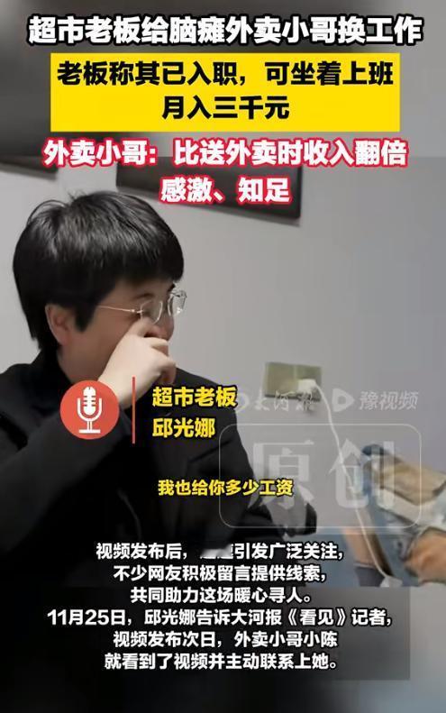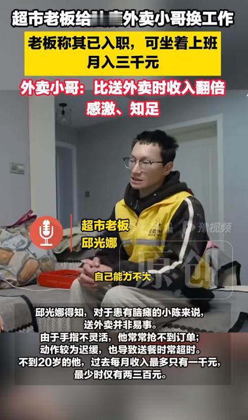 江苏宿迁超市一老板,由于一时疏忽让一外卖员在店内白白等了很久,她感到十分愧疚,果断发布寻人启事,寻找这位残疾外卖小哥。 哪料,见面后才发现,这位19岁小伙因脑瘫求职屡屡碰壁,月收入曾低至两三百元。没想到,邱光娜的一个决定,不仅让他重获工作,还意外点燃了更多希11月26日之前的一个下午,邱光娜像往常一样在店里忙着整理货架。为了不被手机消息打扰,她随手开了飞行模式,全神贯注地整理商品。晚高峰结束后,她发现平台显示有个骑手已在店外等了十五分钟。 当时,她没有多想,照常赔付了超时费,这在外卖行业属于再普通不过的小事。 真正让她停下来的,是晚上的监控复盘。邱光娜每晚都会查看店里的监控视频,这已经成为她的一种习惯。那天,她看到一个摇摇晃晃的身影,手紧握鼠标的手顿了顿。 视频里,那个白天被她“晾在一边”的骑手小哥,走路踉踉跄跄,身体几乎无法控制地晃动,进门时还要扶着货架才能站稳。更让人心疼的是,他在等餐的十几分钟里,一次次尝试打电话联系,却一次次无果。最后,他蹲在墙角,肩膀无力地垂下,显得孤立无援。 他不是不愿意离开,而是在等待那几块钱的外卖订单,这份微薄的收入是他生计的重要来源。 这一幕像重锤一般击中邱光娜的内心,让她瞬间明白,赔付几块钱远不能解决问题。她当晚就截图发了朋友圈,配上了一则“寻人启事”,表示不仅要当面道歉,还想帮这个孩子做点实事。 网络的传播很快,小陈——那个19岁的年轻人——很快被找到了。真正面对面时,他的困境才完全显露出来。小陈先天性脑瘫,中专毕业后,求职之路几乎被堵死。餐馆嫌他动作慢,快递站嫌他跟不上节奏,唯独外卖平台只看敢不敢接单。可手指僵硬、肢体迟缓,使得他抢不到好单,送餐频频超时,差评和罚款像雪球一样滚落。他拼命奔跑时,最好能拿到一千多块,但最糟糕时,一个月到手只有280元,甚至不够支付房租。 邱光娜提出的工作邀请,让小陈一开始有些退缩。这个口吃、行动缓慢的少年,不敢轻易相信善意,害怕给别人添麻烦。经过朋友的劝说,他才小心翼翼地走进超市。邱光娜给出的方案,没有任何怜悯意味,而是一个真实的、体面的岗位:核对购物小票。 这个职位不需要奔跑,大部分时间可以坐着,考验的是耐心和细致。工资和其他员工完全一致,中午提供餐食,也不会因为他的身体状况而降低标准。 为了让小陈安心,她还举例店里其他同事的经历:后厨有位切菜师傅缺了一根手指,动作慢但刀工精细;保洁阿姨只有一只手,却干得比谁都细致。邱光娜告诉他,店里看重的不是速度,而是认真和专注。 从此,超市门口常能看到小陈认真核对每一张小票的身影。虽然脑瘫的后遗症让他头会轻轻晃动,说话有些费劲,但顾客们愿意多等几秒钟,甚至会送上一句赞许。 这场转变,对小陈的母亲来说,更是难以言喻的慰藉。曾经无数次在深夜看着儿子辗转难眠的她,提着自制的酱菜来到超市,握着邱光娜的手,泪水止不住地流下来。她明白,儿子需要的不是施舍的三餐,而是一份让他像普通人一样,靠劳动换取尊严的机会。 如今,小陈每天五点下班,回家还能帮忙摘菜,不再担心深夜突然出现的单子。他的生活有了规律,他的尊严被尊重。邱光娜也没有收下那罐酱菜,反而给了他两袋店里的鸡蛋。这份工作,看似简单,却成为小陈重新站稳生活的支撑。 真正的善意,从来不在于物质的多寡,而在于看到一个生命的尊严,并愿意伸出手,递给他一根名为“信任”的拐杖,让他稳稳地站着,用自己的努力换来生活和尊重。在这个寒冷的冬夜,超市门口那盏为小陈亮着的灯,比任何言语都温暖。望。