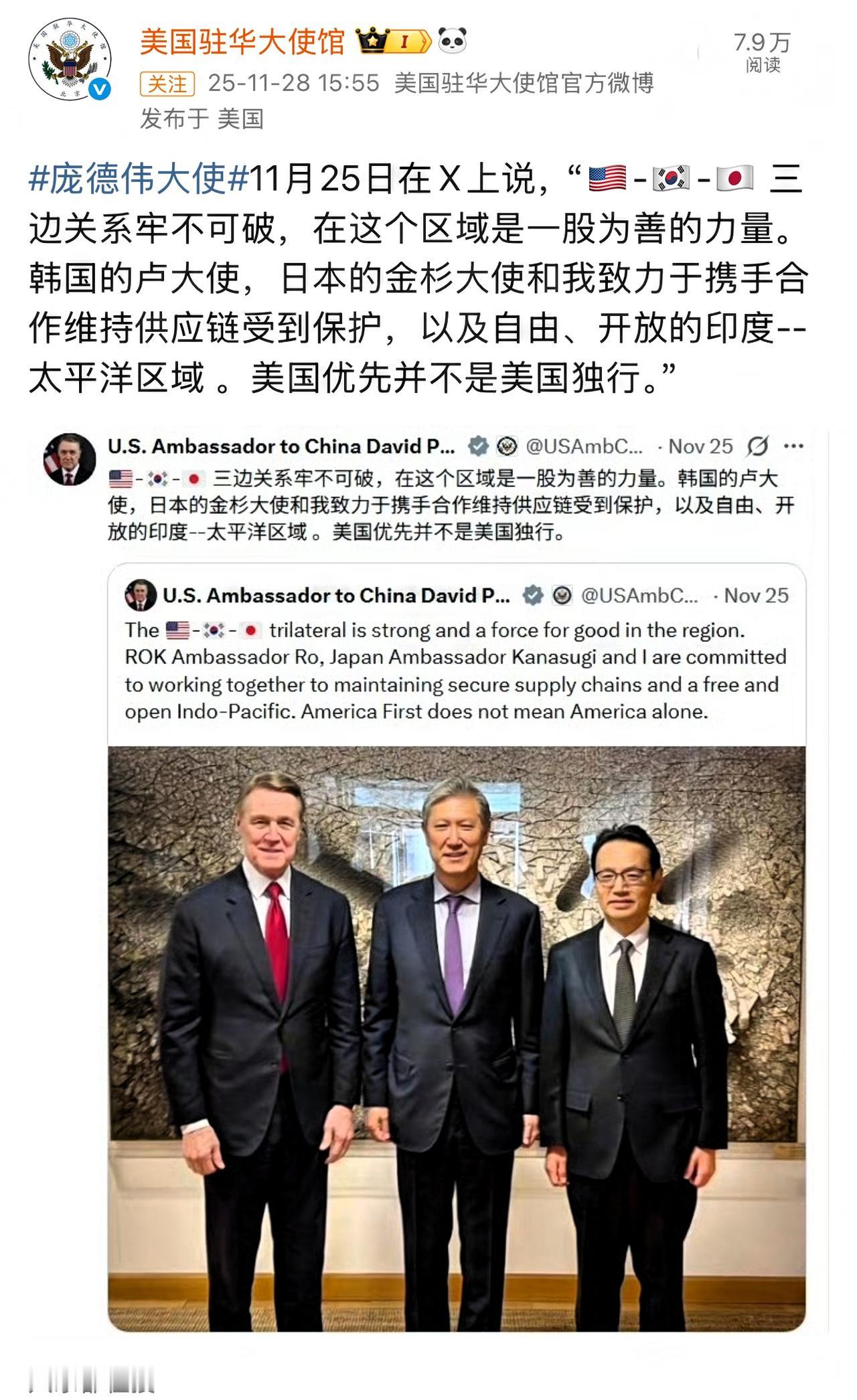 美国新当选鹰派的,对华强硬的驻华大使庞德伟,在推特发帖说美国🇺🇸-韩国🇰🇷-日本🇯🇵三国牢不可破,我觉得美国是在利用韩国和日本,以达到美国在东亚的战略目的,来制衡中国。