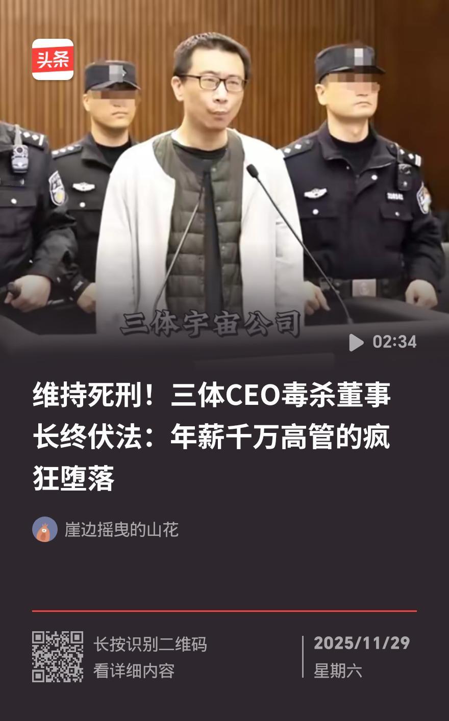 死刑敲定!海归CEO毒杀老板暗害同事,看守所演戏减刑太猖狂 2025年11月 上海高院二审宣判 三体公司原CEO许垚死刑维持原判 这个顶着海归精英光环的职场恶魔 终究为自己的恶行付出了代价 许垚的履历看着光鲜 西南政法本科毕业 法美两国留学拿硕士学位 30多岁就当上集团国际法务负责人 跳槽游族后一路做到三体公司CEO 更是拿下《三体》IP授权的大功臣 可谁能想到 这位西装革履的文化人 心黑得能淌墨 就因为没拿到预期股份 权力被慢慢削弱 眼看要被新人替代 许垚就动了杀心 他伪造公章租库房 冒用别人身份花几十万网购剧毒 躲在办公室和仓库反复做投毒实验 还偷偷溜进老板林奇和同事的办公室踩点 拍下人家桌上的咖啡牛奶保健品 买回同款练怎么投毒不被发现 他先对有竞争关系的同事下慢毒 日常饮品里悄悄加料 收到离职通知后 直接在林奇常吃的益生菌里加了致命剂量 林奇吃了当天就手脚麻木上吐下泻 送医后很快昏迷 最后没抢救过来 益生菌包装上全是许垚的生物痕迹 更让人不齿的是 林奇在ICU抢救时 许垚一边假惺惺打探病情 一边忙着自荐夺权 关进看守所后还不死心 串通狱友演假自杀再救人的戏码 想靠立功减刑 结果被当场拆穿 帮他演戏的狱友也因伪造证据获刑 高文凭没盖住蛇蝎心肠 职场信任反倒成了致命漏洞 你觉得职场中该如何识别这种伪君子 利益面前真的能让人性彻底扭曲吗死缓罪犯 许他已悔大结局 许他已悔大结局