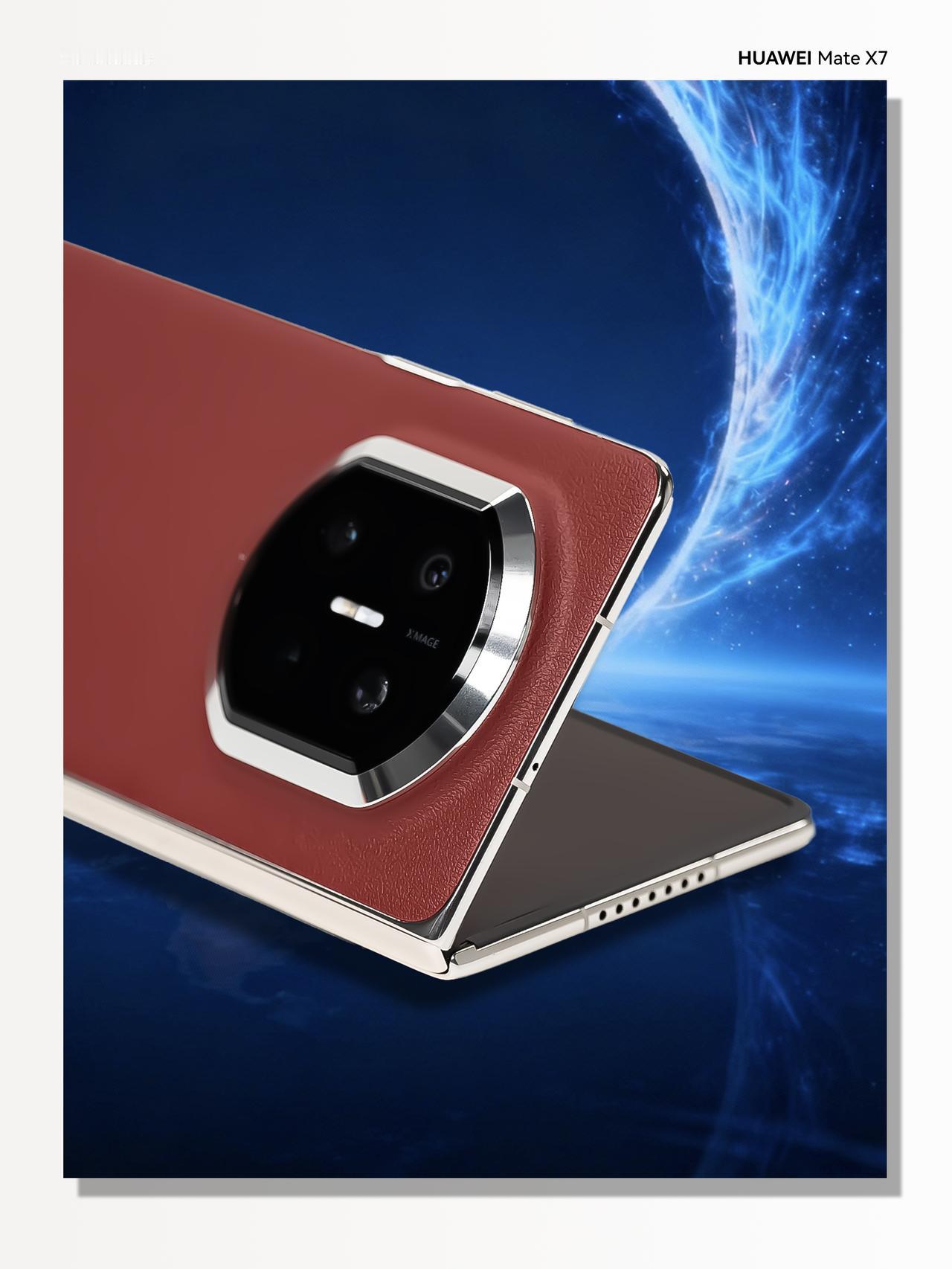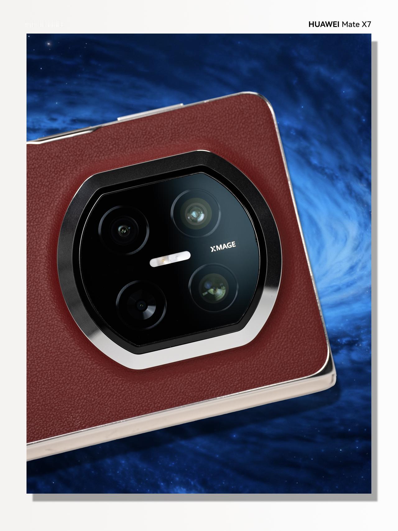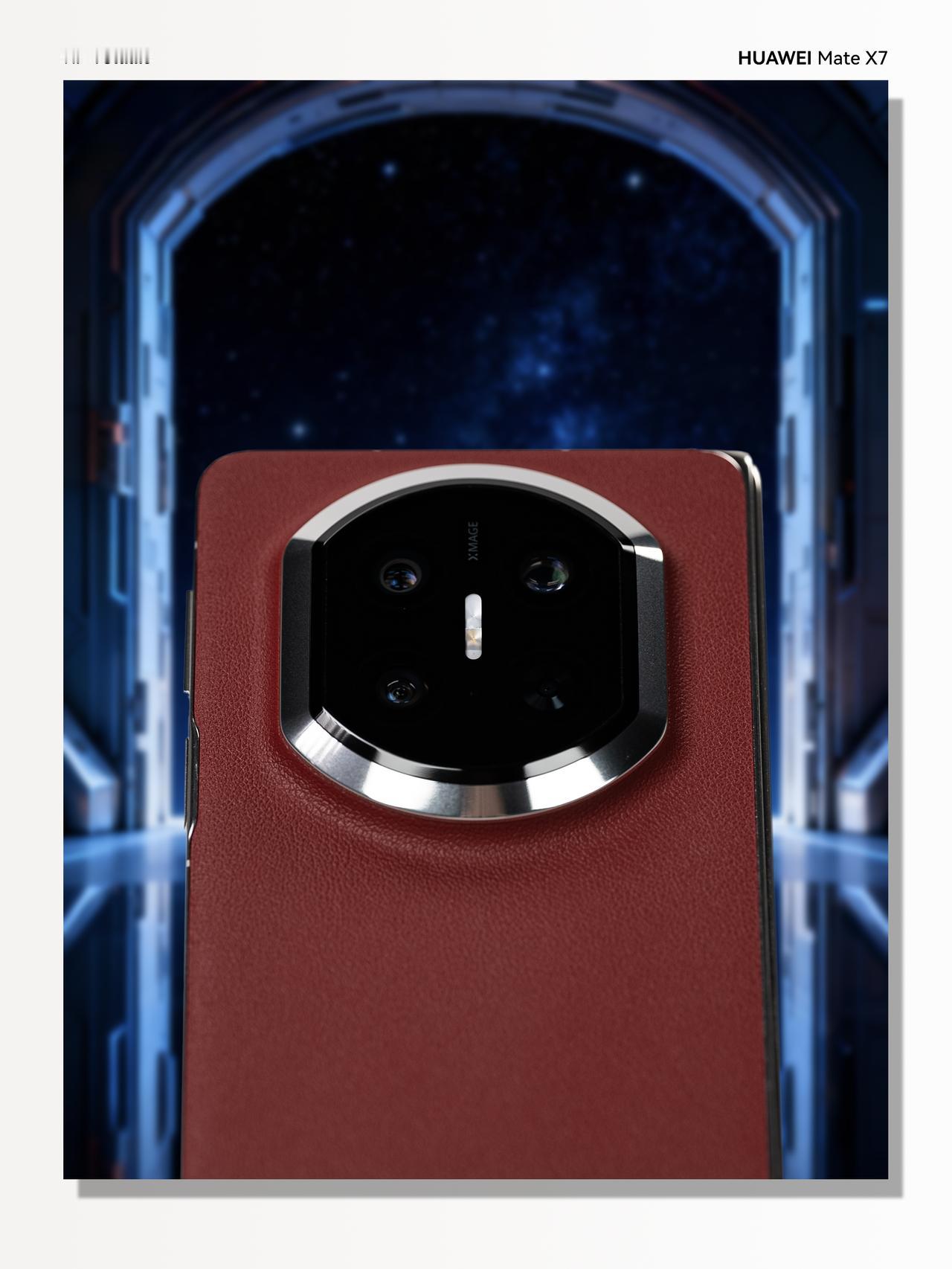 HYK图赏|华为Mate X7 这款是寰宇红配色,后盖融入了非遗云锦工艺,摸起来是素皮的质感,观感很高级,镜头Deco采用多维曲面与立体晶切融合而成的全新“时空之门”设计,看起来会更有层次感。整机展开厚度4.5mm、折叠厚度9.5mm、重量235g左右,手感也很不错。售价12999元起。