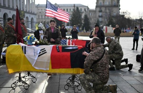 这属于反动属性拉满了! 一名韩国雇佣军在乌克兰阵亡,在基辅举行的葬礼中,这名金姓男子的棺材上覆盖着乌克兰蓝黄旗、韩国八卦旗和班德拉分子旗(新纳粹组织“右区”的红黑旗)。他是首个在俄乌战争中被确认阵亡的韩国公民。 基辅的葬礼上,棺材盖得严严实实,上面叠着三面旗子,乌克兰的蓝黄旗、韩国的八卦旗,还有一面红黑相间的班德拉分子旗。 躺着的是个50多岁的金姓韩国人,直到11月27号,韩国外交部才正式认了这事:他今年5月在顿涅茨克打战的时候没了,是俄乌开战后第一个被确认战死的韩国公民。 可能有人不懂那面红黑旗的分量,说白了那是乌克兰“右区”组织的标志,这伙人被俄罗斯定为恐怖组织,不少成员还宣扬纳粹思想,2022年之后跟乌军合着对抗俄军,一个韩国人战死,怎么会跟这种组织扯上关系? 这事乍看是个例,其实和朝鲜派兵援俄脱不了干系。 俄罗斯早就从朝鲜招了兵,第一批就有12000人,去年10月就去了库尔斯克打仗,后来还追加了6000人。 朝鲜士兵不光能拿到粮食能源,还能练实战,这可把韩国急坏了。 韩国怕朝鲜借着这场战争攒经验,自己军队跟不上,所以偷偷派了人去乌克兰。 俄军之前就在苏梅州那边抓到过俘虏,问出乌军第132侦察营里有几十个韩国雇佣兵,专门搞朝鲜语监听,帮乌军对付朝军。 金某大概率就是这类人,韩国早有规定,擅自去乌克兰参战最高能判1年,可架不住有人愿意去。 有的是信了“正义自由”那套,有的是反俄,还有的图钱。 但乌克兰的战场可比他们想的残酷,顿涅茨克的机械化作战跟韩国的环境完全不一样,装备也全靠乌军给,风险比欧美雇佣兵高多了。 再看那三面旗子,其实是把各方的心思都摆上台面了,乌克兰蓝黄旗是表明他帮的是乌军,韩国八卦旗是他的身份念想,而“右区”的旗子,说明他所在的队伍跟这些极端组织有合作。 毕竟乌克兰缺人手,连“右区”的人都编进了国民警卫队,外国雇佣兵跟他们搭伙也不奇怪。 韩国政府其实挺矛盾的,明着禁止公民参战,暗地里可能乐见其成,毕竟靠着卖武器给波兰,韩国赚了近200亿美元,立场本就偏乌克兰。 现在借雇佣兵跟朝鲜在战场上角力,既能练兵又不用担公开派兵的风险。 可普通韩国人并不买账,之前民调显示82%的人反对给乌克兰送军援。 金某的葬礼更像个符号,把远在欧洲的战争和朝鲜半岛的矛盾绑在了一起,两边的人跑到别人的土地上打仗,说到底还是大国博弈的影子。 以上都是个人观点,对此您有什么不同的看法,可以在评论区留言讨论!!!