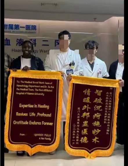 情况属实!冈比亚留学生死里逃生,她遇到了中国好医生! 厦门大学的冈比亚留学生小卡身体不舒服去厦门大学附属医院检查,最终经过医生的确认为急性白血病,需要紧急进行救治,不然有生命危险。 厦门大学附属医院专家组立即对留学生小卡进行会诊并制定了诊疗方案,经过专家们及时的救治,留学生小卡病情稳定了下来,经过最终检查各项指标趋于好转,小卡已经脱离生命危险,接下来进行巩固恢复。 留学生小卡为了感谢中国医生给予她的第二次生命,特意制作了锦旗表达感激之情。 留学生小卡是幸运的,在中国遇到了好医生,她的生命才得以延续。希望她不要忘了中国的恩情,多做对中国有益的事情。非洲来华留学生 非洲医疗队
