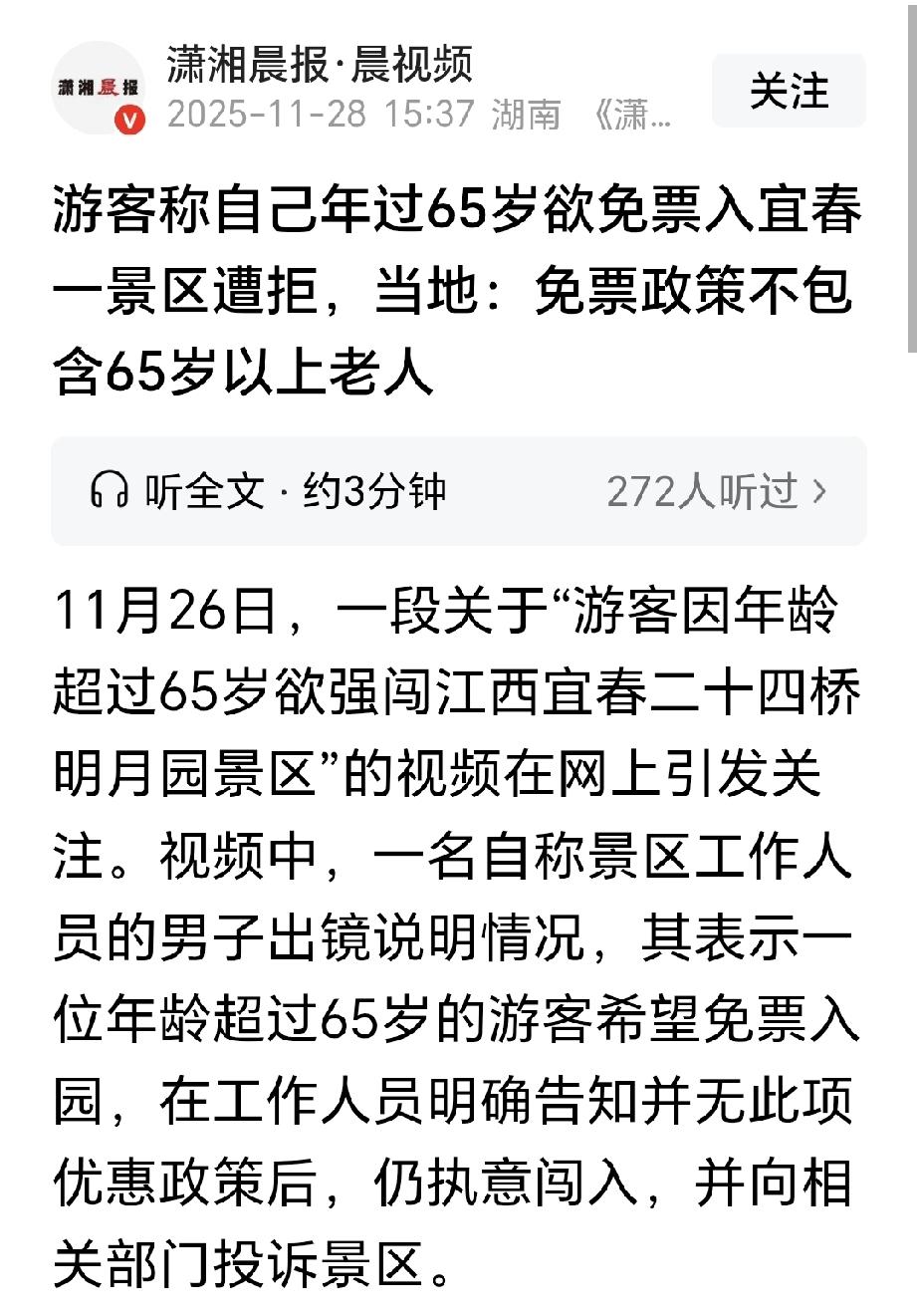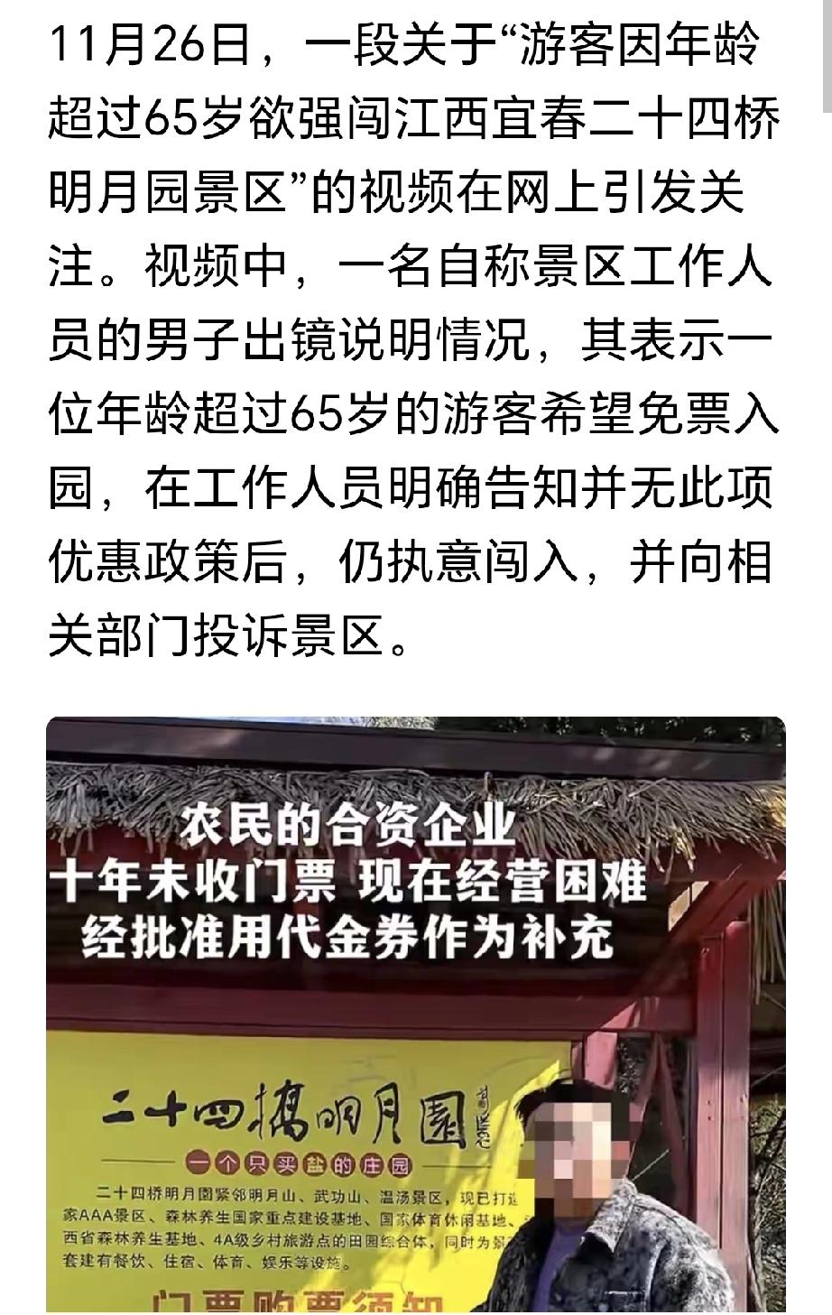 一些上年纪的人,真的是让人尊重不起来! 早上看到两条视频,一条视频是一位公交司机录播的,从视频上推断是发生在平顶山市新城区的。她说一位经常乘坐她这趟公交车的老年女乘客,对这路公交车非常满意,不但环境好,而且还有松软的座垫,让人坐上舒服,其他车上就没有。这位女司机告诉她,这些座垫都是司机们花自己的钱买的。这位老年女乘客来了一句:为什么别的司机咋不能掏钱买呢?这一句令人心塞的话语,令我们的女司机无语,她不好直面回应,只能是发视频一吐心中的郁闷了。平顶山市公交司机的工资情况,也经常在媒体上看到,这里不再赘言。 另一条视频说的是宜春二十四明月园,一位65岁的男性,想免费进该园游玩,在工作人员告诉他无此项优惠时,他仍想强行闯入无果,便向相关部门进行投诉。从媒体发布的消息来看,这是一家农民合资合作建的景区,之前10年一直是免票的,后来因经营困难,在向相关部门申请并获批后,才开始收费的,并且这30元所谓的门票,还是以园区代金券的形式购买的,在景区门口也公示了哪些特殊人群是可以免费游园的。 我也是步入老人之列的一员,但对上述两名老者的行为只能用反感和厌恶来表述了。 尊老是我们中华民族的优秀传统,可有些上了年纪的人,却把这一传统,当作了倚老卖老的依仗,从而极大地损害了老年人这一谁都避不了的群体声誉。 老人应该有老人的样子,别人对你的尊重,并不仅仅是因你的年龄,更是因为你的行为。你上了年纪,社会阅历较之年轻人要更多,你的一举一动、一言一行更应该注意其影响,不说成为年轻人学习的楷模吧,但至少不要做有违社会常理和胡搅蛮缠的事儿。你这依靠着年龄上的特殊,只会使你变成一个倚老卖老的令人讨厌者!