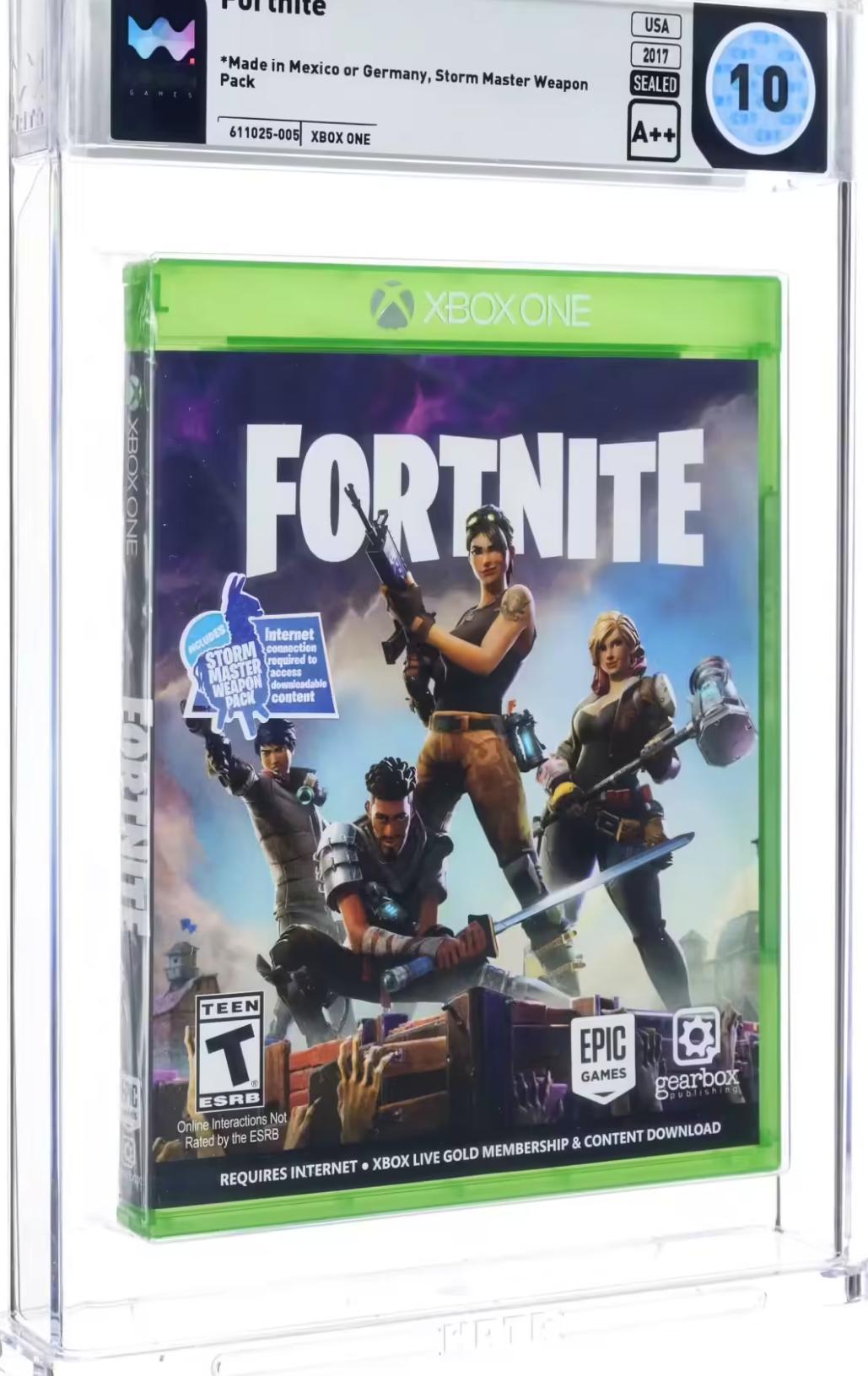 【《堡垒之夜》实体版以4.25 万美元拍卖】《堡垒之夜》XB1实体版近日在Heritage Auctions拍卖会以4.25万美元(约30.07万元人民币)成交。该版本获得WATA评级公司10 A++满分认证,保持原始密封状态,附带"风暴主宰"武器包及"守护家园"模式访问权限。2017年由Gearbox发行的该版本发行量极少,原售价仅60美元。此次成交价较原价上涨70733%,但未打破电子游戏拍卖纪录。当前吉尼斯世界纪录官方认可纪录为2021年以156万美元(约合1103万人民币)成交的《超级马力欧64》N64原封版。