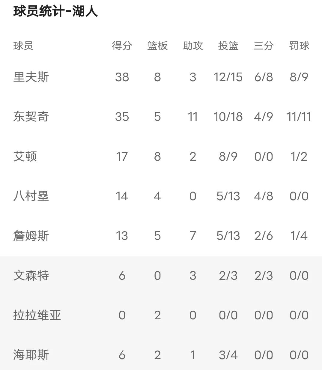 詹姆斯获首发五人最低得分,里夫斯和东契奇都得35+得分,詹姆斯战术地位被剥夺!东契奇摊手为何突入内线的詹姆斯没有把球传给自己,即使球打进了!看着这个赛季的詹姆斯确实令人心酸,湖人新老板不待见,续约合同迟迟无法敲定,场均得分、篮板、助攻都创下进入NBA联盟以来的新低,没有了战术地位,就如迟暮的狮王一样被狮群嫌弃,连之前闻风丧胆的鬣狗也来欺负了!只能卑躬屈膝的表态:只要球队需要我做什么,我就做什么!没有了霸气外露的心态,只能轮为平庸,最后被联盟淘汰!NBA吐槽大会