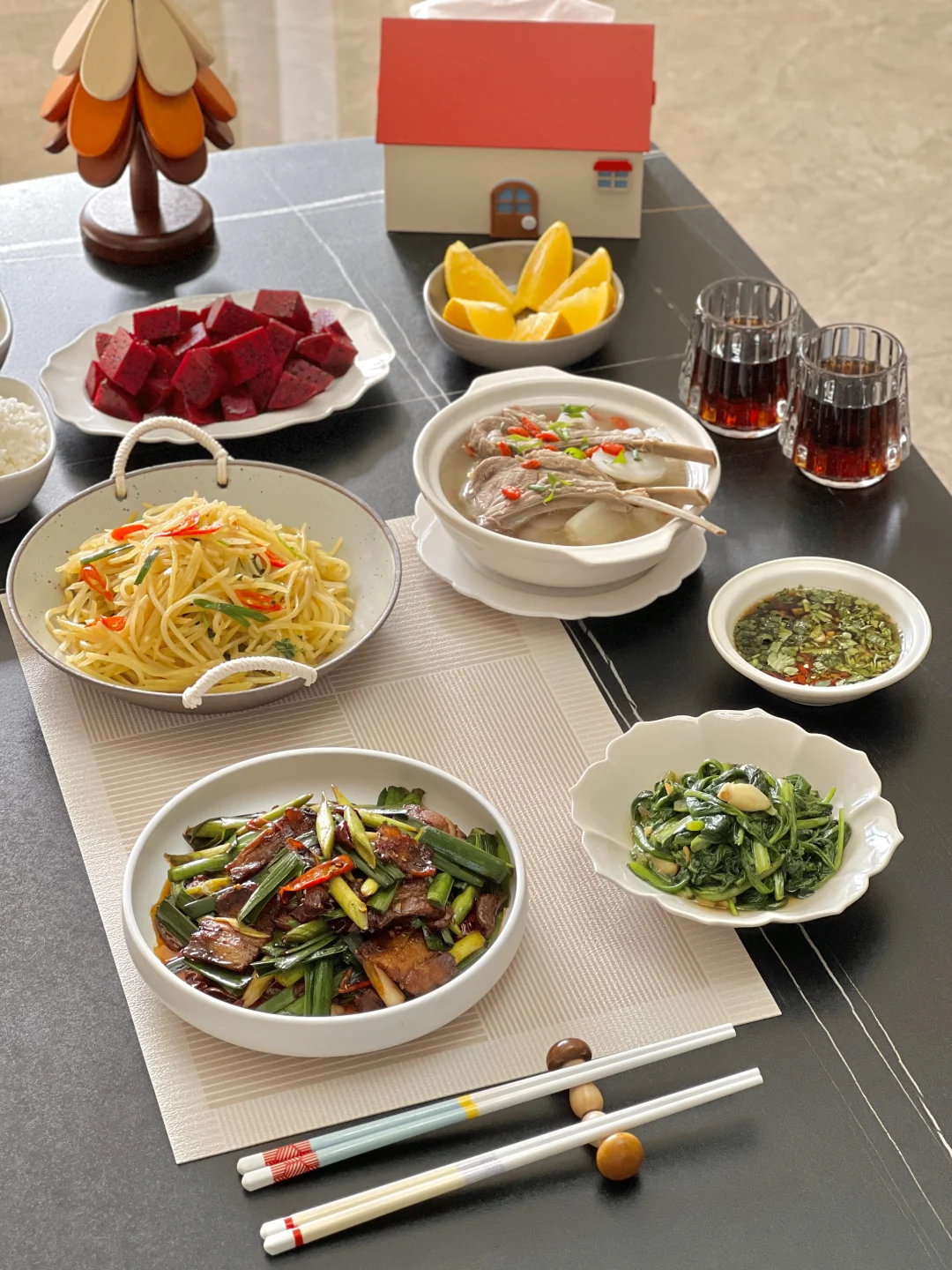 今天菜系的主题是下饭!酱香浓郁的回锅肉,配上微微辣的泰椒土豆丝,狠狠干了一大碗饭[大笑R][大笑R]清炖羊排能吃肉喝汤,配上一点韭菜花也是别有一番风味~[派对R][派对R]