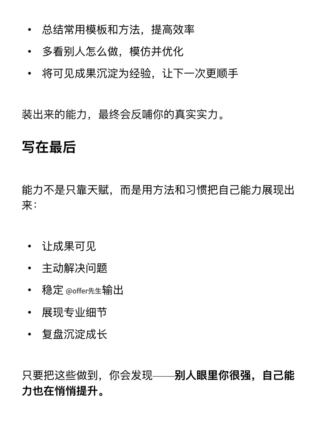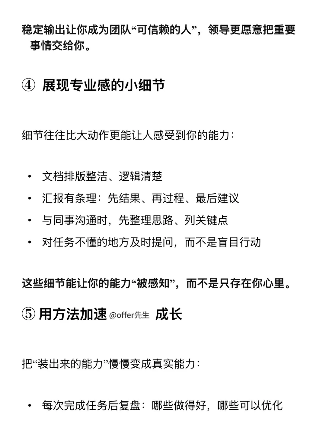 很多人觉得能力强是天生的、经验累积的结果。 其实,在日常工作中,有些能力是可以通过刻意方法展现出来的。 不是假装,而是让别人清楚看到你的价值和可执行力。 … 一个认真分享“找工作”干货的账号,真诚、有料、不说空话 ·