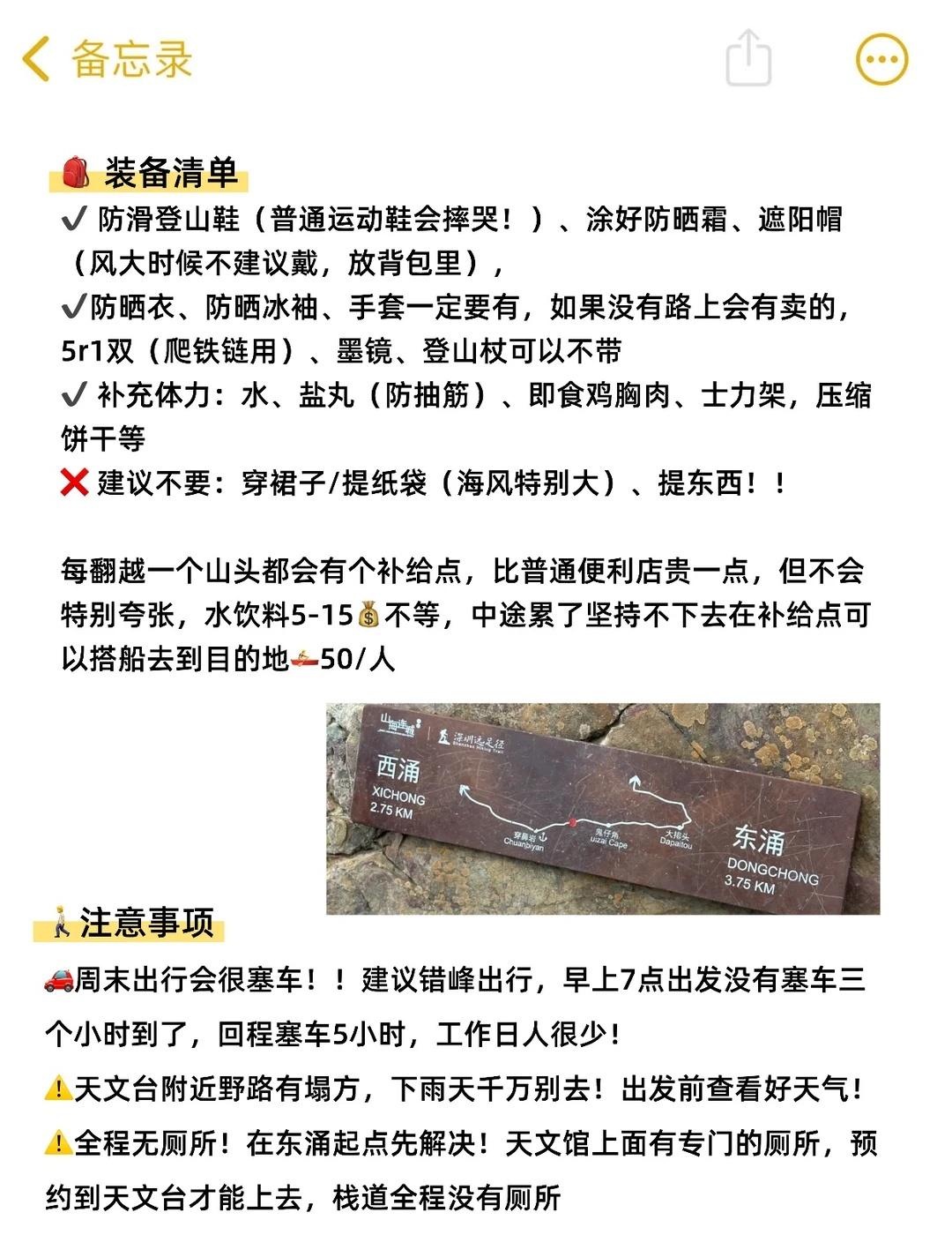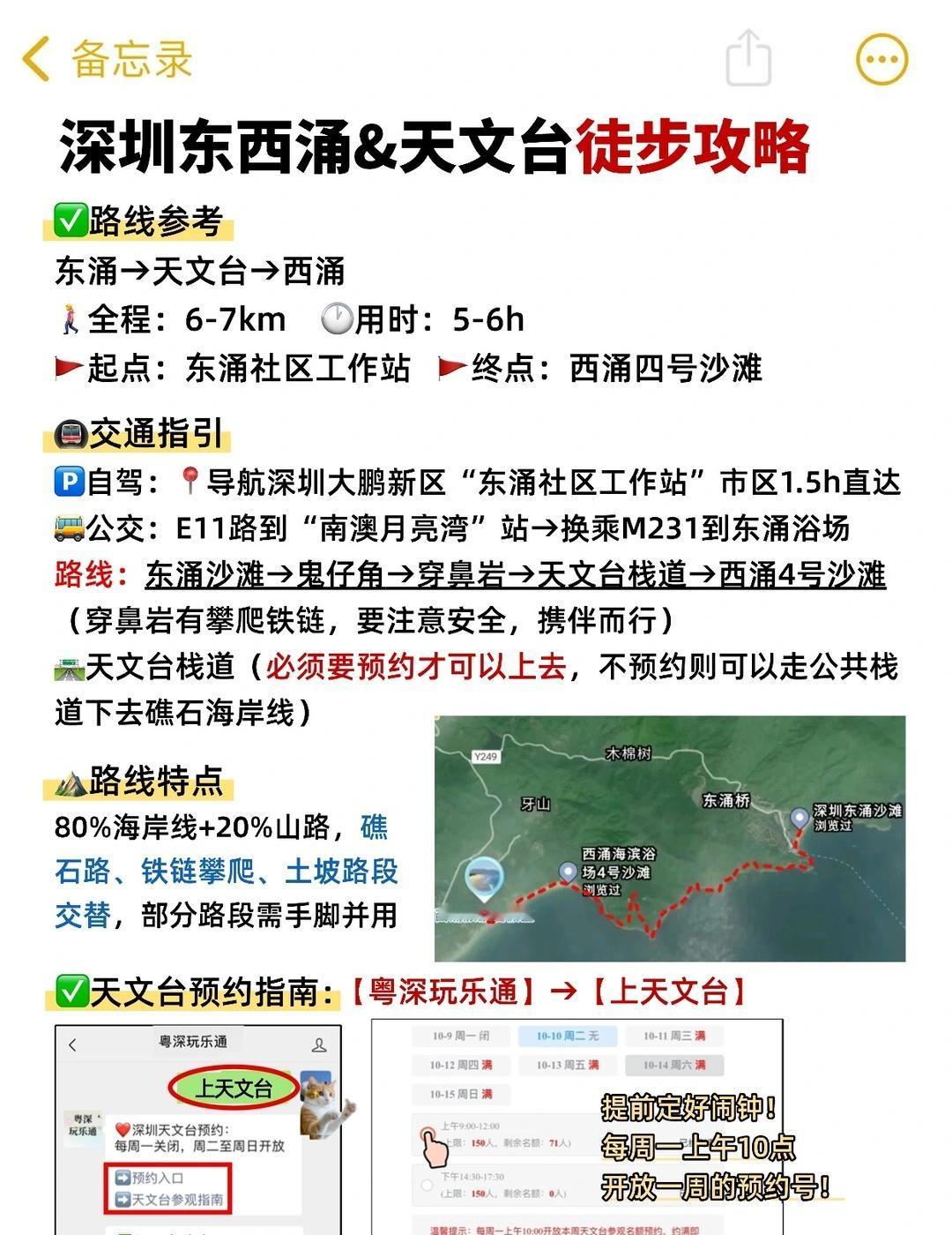 深圳东西涌天文台沿海岸线徒步全攻略周末冲 东西涌天文台被『国家地理』评为 中国最美十大海岸线之一!建议在深圳的徒步爱好者一定要去一次!❤️分享徒步攻略!周末拉上搭子一起冲 ✅路线参考 东涌→天文台→西涌 🚶♀️全程:6-7km 🕐用时:5-6h 🚩起点:东涌社区工作站 🚩终点:西涌四号沙滩 🚇交通指引 🅿️自驾:📍导航深圳大鹏新区“东涌社区工作站”市区1.5h直达 🚌公交:E11路到“南澳月亮湾”站→换乘M231到东涌浴场 路线:东涌沙滩→鬼仔角→穿鼻岩→天文台栈道→西涌4号沙滩(穿鼻岩有攀爬铁链,要注意安全,携伴而行) 🛣️天文台栈道(必须要预约才可以上去,不预约则可以走公共栈道下去礁石海岸线) 预约&假日专线巴士攻略:【粤深玩乐通】→上天文台 ⛰️路线特点 80%海岸线+20%山路,礁石路、铁链攀爬、土坡路段交替,部分路段需手脚并用 🎒 装备清单 ✔️ 防滑登山鞋(普通运动鞋会摔哭!)、涂好防晒霜、遮阳帽(风大时候不建议戴,放背包里), ✔️防晒衣、防晒冰袖、手套一定要有,如果没有路上会有卖的,5r1双(爬铁链用)、墨镜、登山杖可以不带 ✔️ 补充体力:水、盐丸(防抽筋)、即食鸡胸肉、士力架,压缩饼干等 ❌ 建议不要:穿裙子/提纸袋(海风特别大)、提东西!! PS:每翻越一个山头都会有个补给点,比普通便利店贵一点,但不会特别夸张,水饮料5-15💰不等,中途累了坚持不下去在补给点可以搭船去到目的地🚣50/人 🚶注意事项 🚗周末出行会很塞车!!建议错峰出行,早上7点出发没有塞车三个小时到了,回程塞车5小时,工作日人很少! ⚠️天文台附近野路有塌方,下雨天千万别去!出发前查看好天气! ⚠️全程无厕所!在东涌起点先解决!天文馆上面有专门的厕所,预约到天文台才能上去,栈道全程没有厕所 户外徒步 徒步丈量世界 深圳东西涌穿越 海岸线穿越 户外徒步爬山 深圳天文台 深圳徒步 深圳天文台徒步