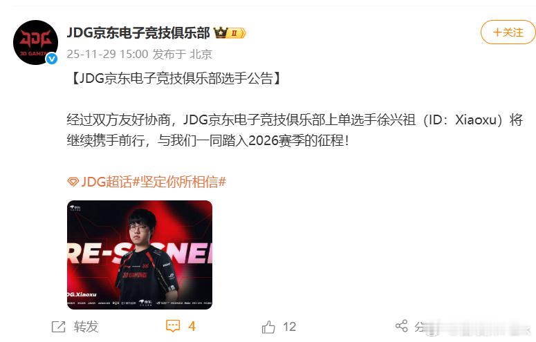 JDG官宣Xiaoxu续约,新赛季的队友是Junjia、天才中单红q、Gala、V神,由Tabe小白带队。说实话第三赛段Xiaoxu打得真不错,已然成了队内大腿,明年或许是他距离世界赛舞台最近的一年。JDG官宣Xiaoxu续约 2025LOL冬季转会期 ACG优创官
