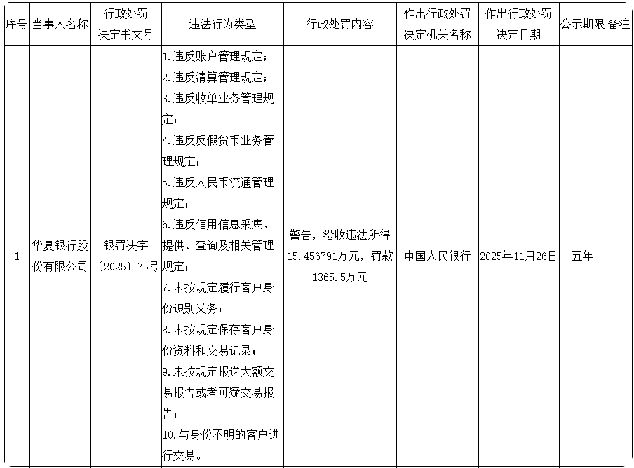 中国人民银行银罚决字〔2025〕75-83号显示,因账户管理、清算、收单等10项业务违规,华夏银行被处以警告,没收违法所得15.456791万元,并处以罚款1365.5万元,合计罚没金额达1380.96万元。同时,该行8名责任人遭1万元至13万元不等的罚款,其中3人同时被警告。