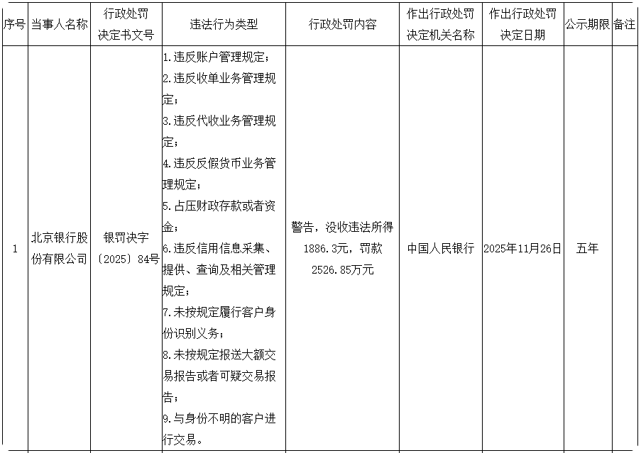 中国人民银行银罚决字〔2025〕84-95号显示,北京银行因涉及账户管理、收单业务、代收业务等9项违规行为,被处以警告、没收违法所得1886.3元,并处罚款2526.85万元。另有11名工作人员遭罚,涉及多个部门。