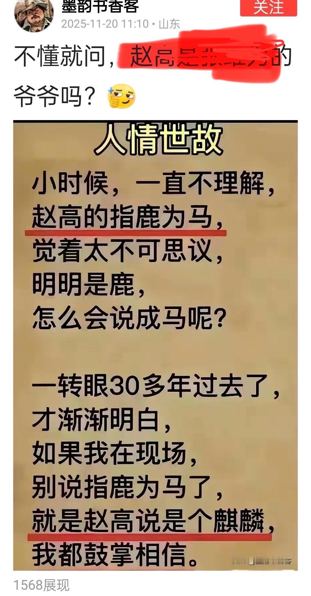 赵高(?-前207年)是秦朝中车府令、丞相,与李斯合谋篡改遗诏立胡亥为帝,指鹿为马排除异己,加速秦朝灭亡。两千多年来,赵高家的香火一直没断过。一个朝代,一个朝代,过去了,又过去了!赵高们功不可没!