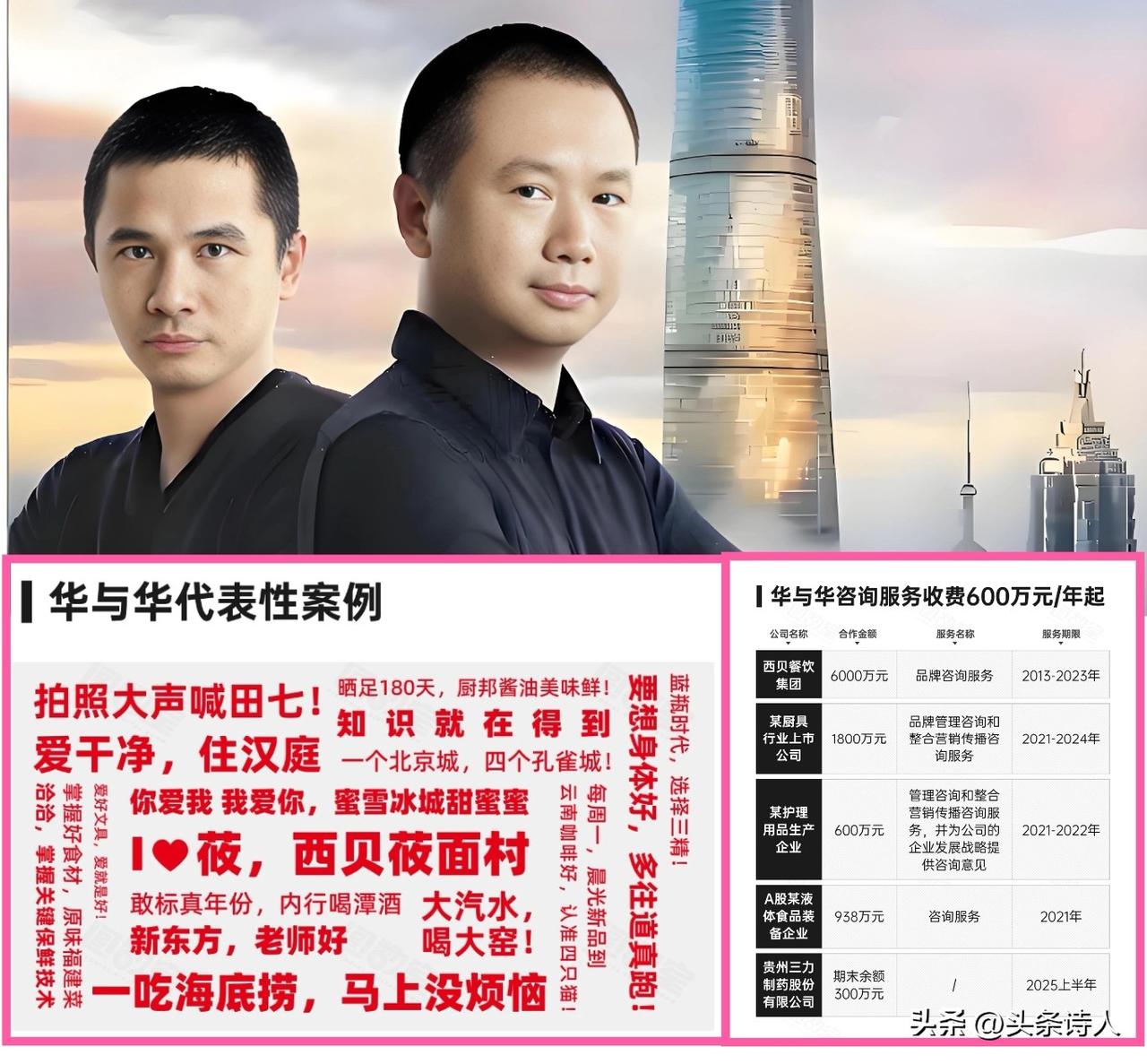 华与华,网友总笑这两兄弟顶着个“傻而大”的脑袋,笑他们“土得傻不拉几”,他却在暗地里笑你们“看不穿”,不懂他们的底气所在... 👀看看跟他合作的大品牌们 不乏各行各业的大佬,诸如:西贝、海底捞、鱼你在一起、厨邦、蜜雪冰城... 哪一个拿出来,不是各自领域的佼佼者?? 这些大品牌愿意花普通人一辈子都挣不到的钱去跟华与华合作 图啥?? 当然图的是能切实落地,能为品牌创造实际效益,增强品牌影响力的营销方案! 那些大品牌的老总们也不是那么好忽悠的 他们最懂得什么营销方案适合自身品牌 愿意花几百甚至上千万把这件事关乎品牌发展的事,交给华与华去做 也从另一方面证实了【华与华】在这一方面确实有独到之处 尽然,最近华与华在“西贝和老罗”和“罗与华”的事件中,他们的很多说法、做法和战略、战术,遭到了很多网友的吐槽 但不可否认,他们身上确实是有自己的闪光点 华与华之所以敢在“罗与华”事件中不服软,大概底气就来自于此吧? 你们怎么看??